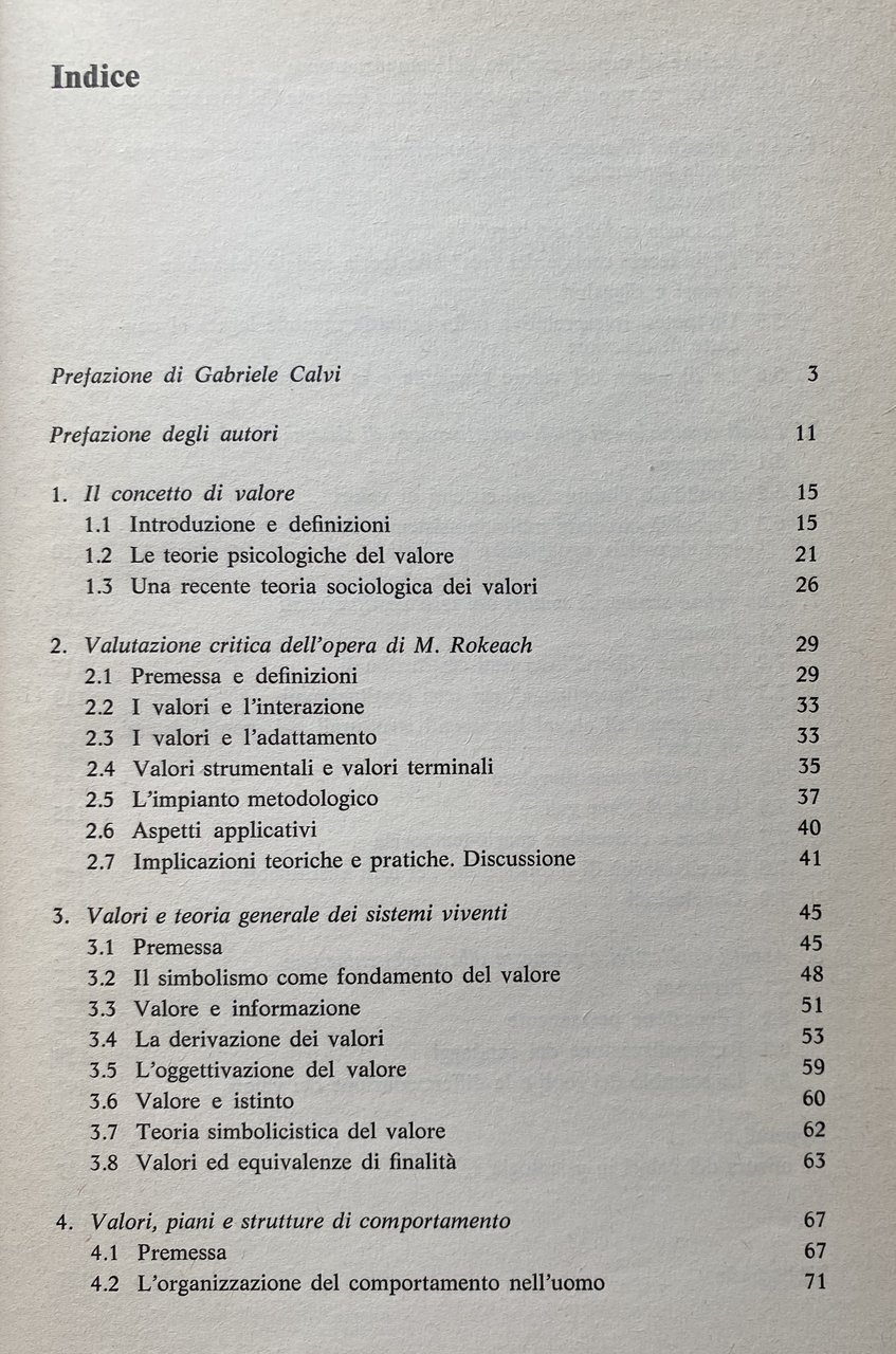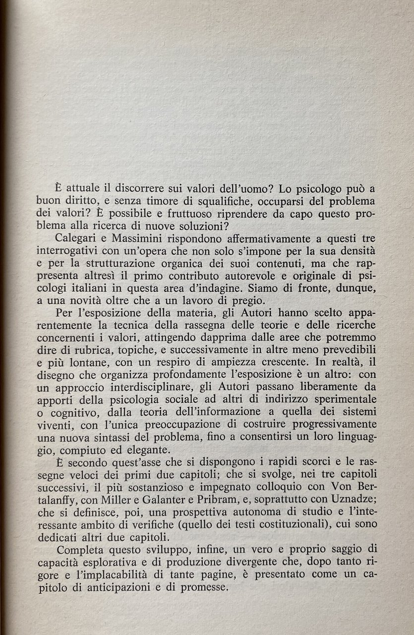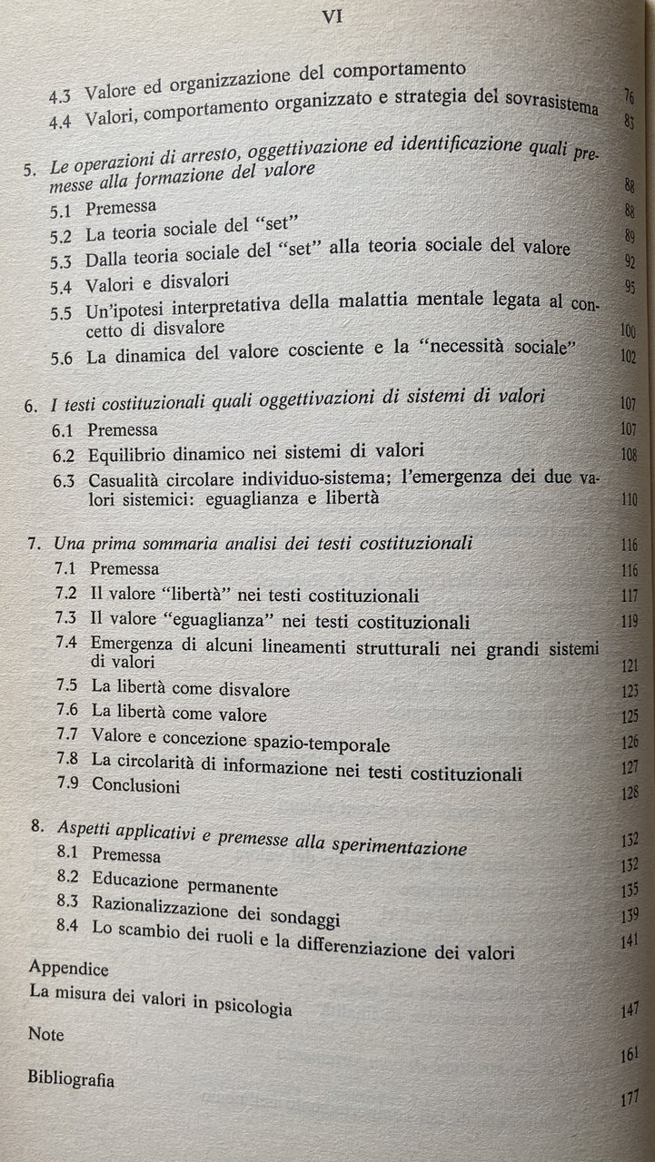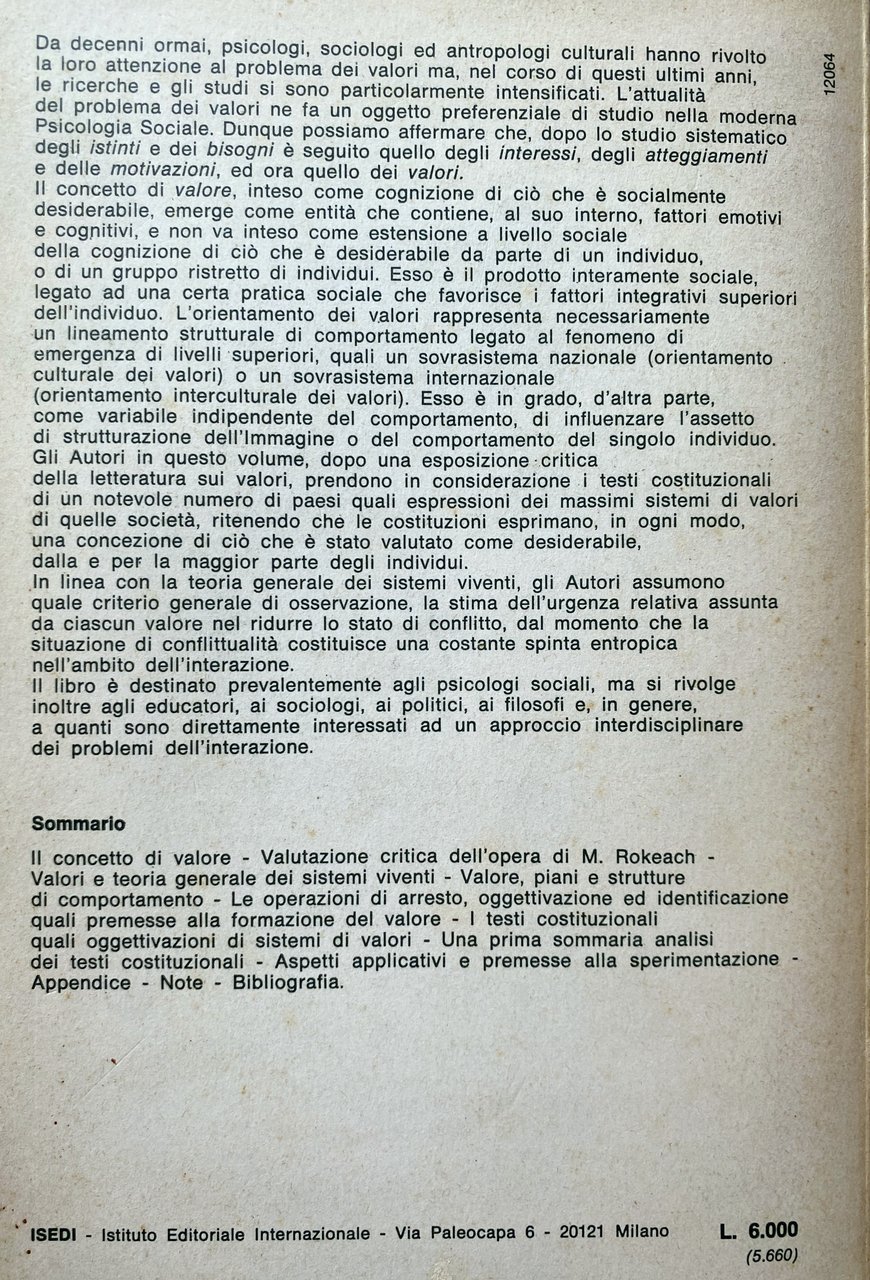Sommario. Il concetto di valore. Valutazione critica dell'opera di M. Rokeach. Valori e teoria generale dei sistemi viventi. Valore, piani e strutture di comportamento. Le operazioni di arresto, oggettivazione ed identificazione quali premesse alla formazione del valore. I testi costituzionali quali oggettivazioni di sistemi di valori. Una prima sommaria analisi dei testi costituzionali. Aspetti applicativi e premesse alla sperimentazione. Appendice. Note. Bibliografia.
