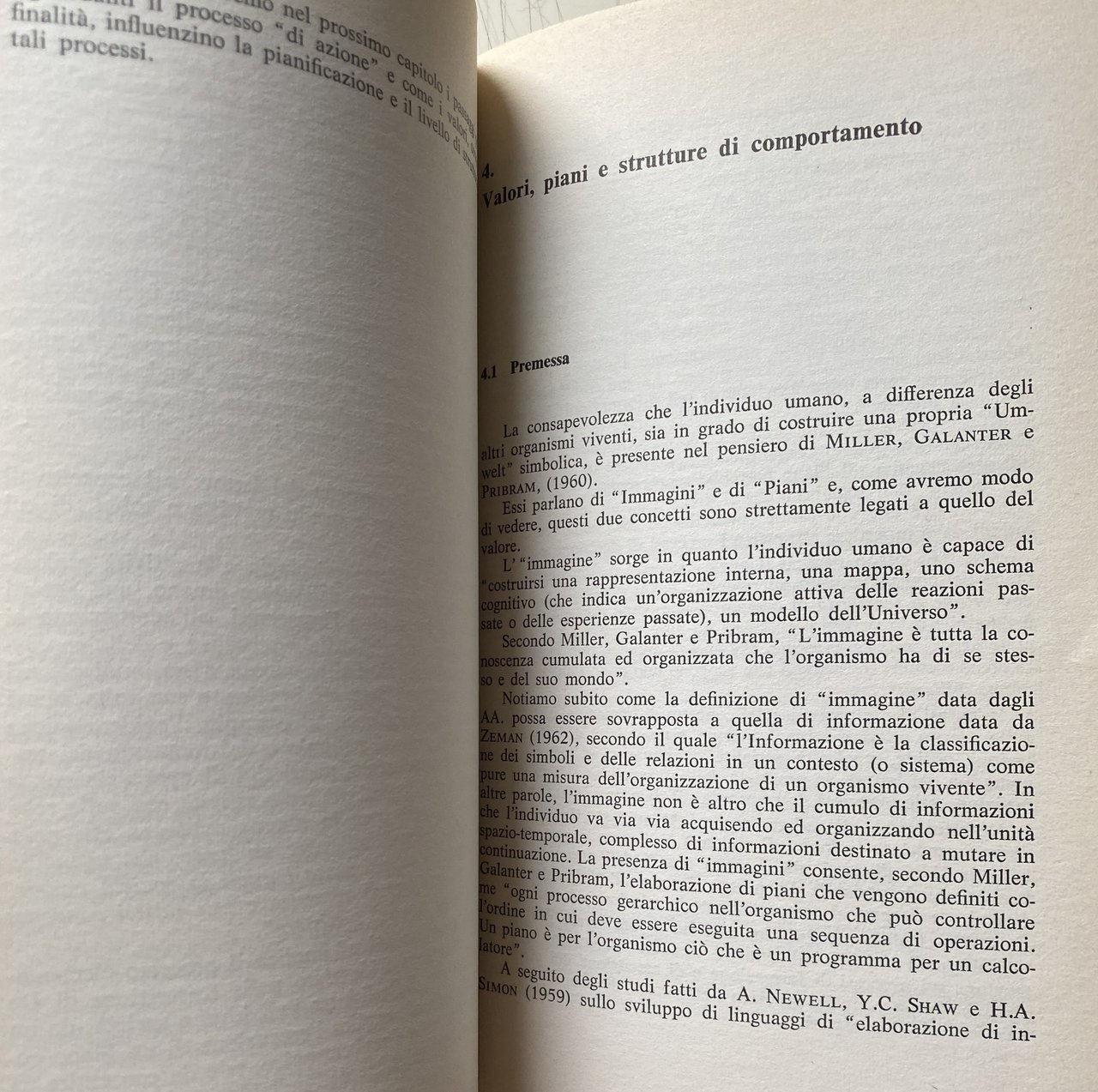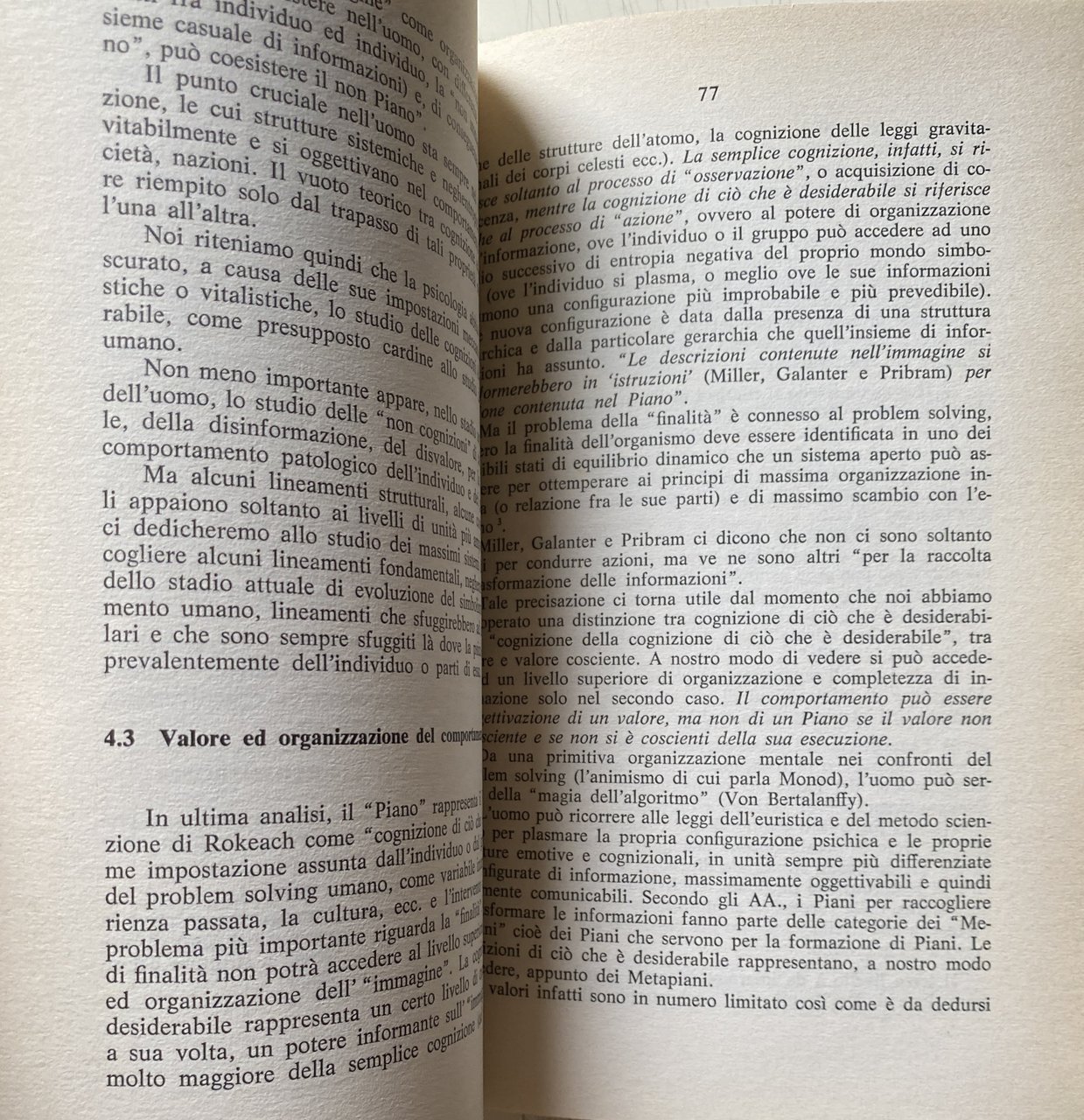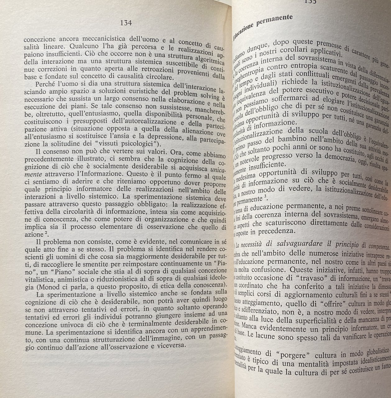 Sommario. Il concetto di valore. Valutazione critica dell'opera di M. Rokeach. Valori e teoria generale dei sistemi viventi. Valore, piani e strutture di comportamento. Le operazioni di arresto, oggettivazione ed identificazione quali premesse alla formazione del valore. I testi costituzionali quali oggettivazioni di sistemi di valori. Una prima sommaria analisi dei testi costituzionali. Aspetti applicativi e premesse alla sperimentazione. Appendice. Note. Bibliografia.