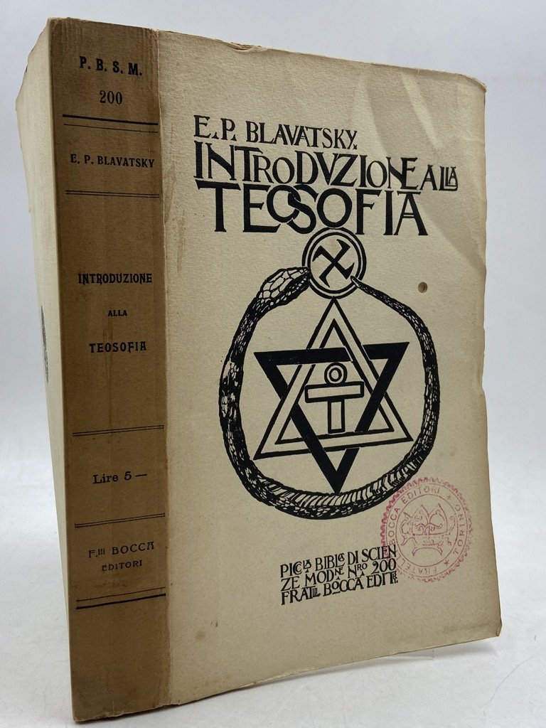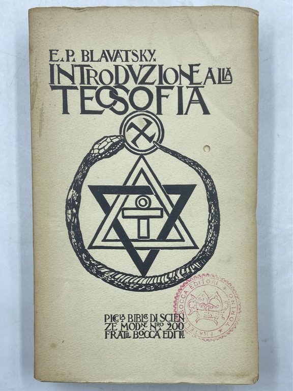 Brossura editoriale illustrata, cm 21 x 13, pp (4) 381 (3) + pecetta di errata e catalogo editoriale di 4 pagine in velina verde. Timbro dell’editore sul piatto anteriore e sul frontespizio, foro fustellato sul piatto anteriore e prime 4 carte, lievi sgualciture, piccoli difetti sulla brossura. Prima edizione italiana, con traduzione di G. B. Penne, di The Key to Teosophy, testo di divulgazione dei principi della teosofia pubblicato da Madame Blavatsky nel 1889.