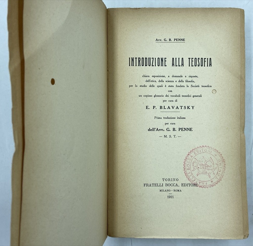 INTRODUZIONE ALLA TEOSOFIA chiara esposizione, a domande e risposte, dell’etica, della scienza e della filosofia, per lo studio delle quali è stata fondata la Società teosofica, con un copioso glossario dei vocaboli teosofici generali per cura di E. P. Blavatsky. Prima traduzione italiana per cura di G. B. Penne.