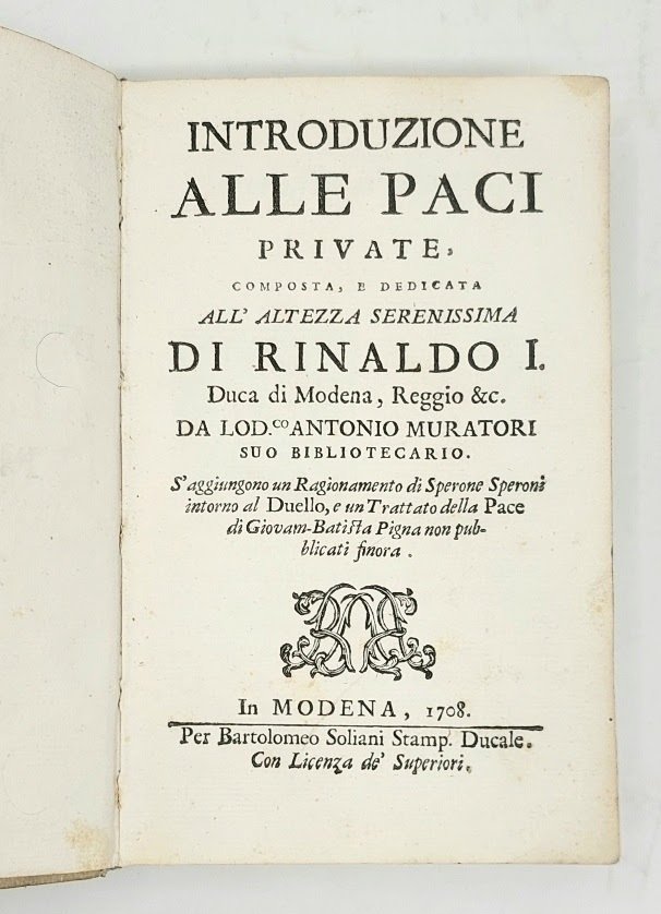 Introduzione alle paci private, composta, e dedicata all'altezza serenissima di Rinaldo I. Duca di Modena, Reggio &c. da Lod.co Antonio Muratori suo bibliotecario. S'aggiungono un Ragionamento di Sperone Speroni intorno al Duello, e un Trattato della Pace di Giovam-Batista Pigna non pubblicati finora.
