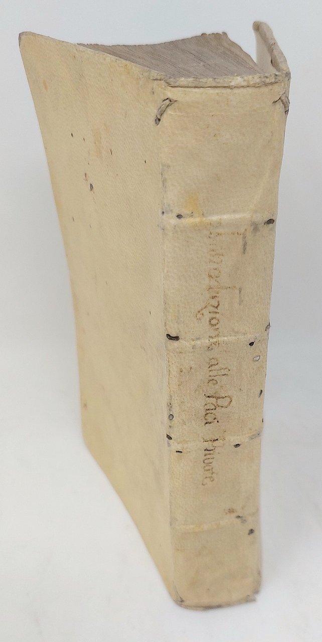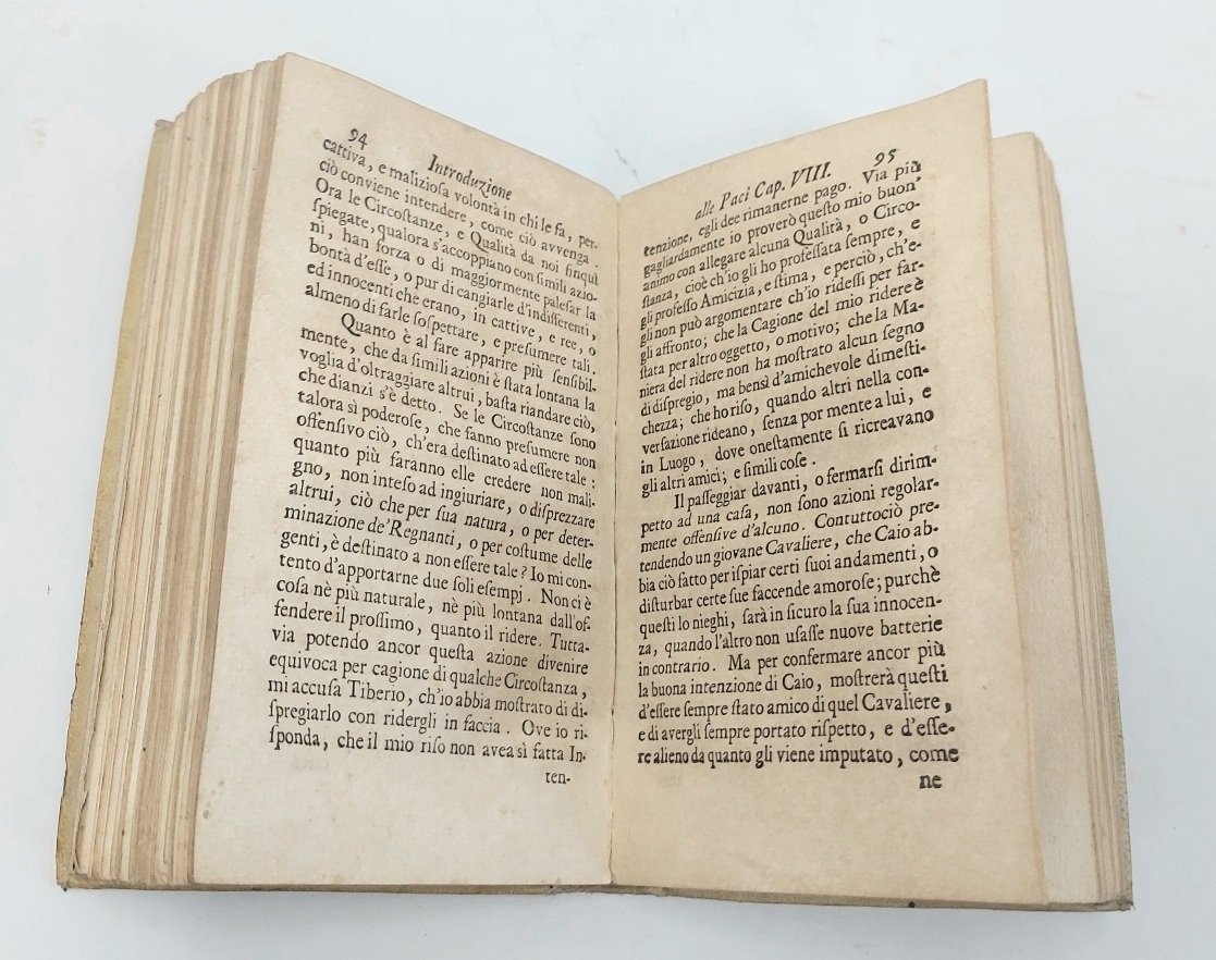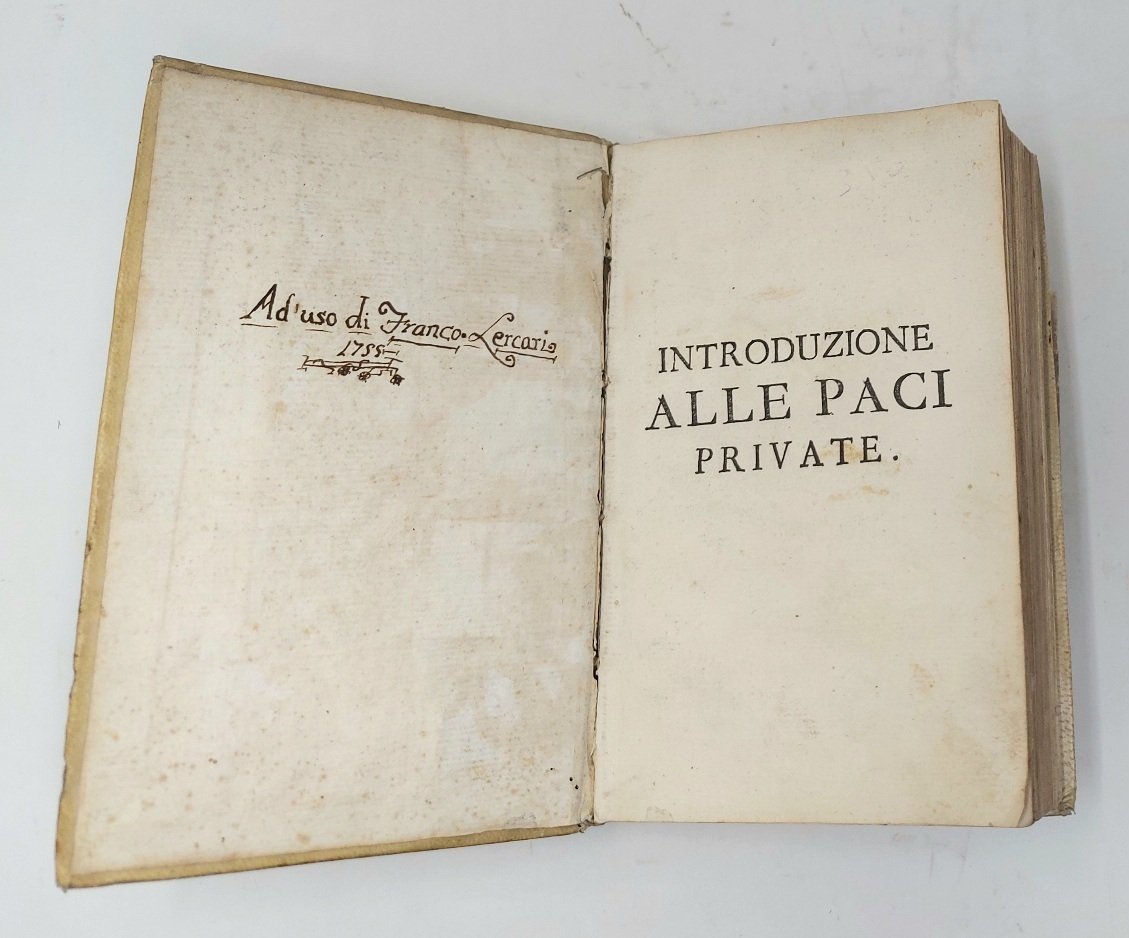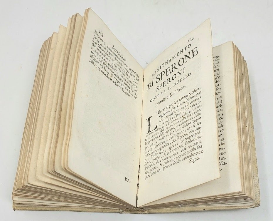 >In-8, (170x110 mm), pp. (12), 287, (1). Legatura in pergamena rigida coeva, dorso a quattro nervetti con titolo manoscritto. Occhietto, fregio xilografico al frontespizio, capilettera xilografici. Prima edizione di tutte e tre le opere, di argomento filosofico-giuridico e cavalleresco, che trattano dei comportamenti nobiliari improntati al sistema dell'onore nella composizione delle liti private, con espedienti tra i quali, ancora nel primo '700, figurava il duello tra gentiluomini per dirimere le dispute. A testimonianza dell'attualità dell'argomento, Muratori non solo ne scrive, ma si fa punto di pubblicare due opere che per lungo tempo erano rimaste inedite; è infatti ben noto che a sollecitare la riflessione del modenese erano stati i molti casi di liti e contese, di duelli e di brighe, non solo nel Ducato, ma in varie parti d'Italia dove il duello era ancora largamente in uso. Buon esemplare di opera non comune, assai fresco (lieve ed uniforme brunitura su poche pagine); al contropiatto anteriore nota ms. di possesso "Ad uso di Franco Lercari 1755"..