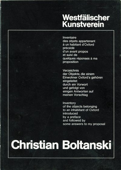 In January 1973, Christian Boltanski (b. 1944) sent 62 handwritten letters to museums of art, history and anthropology around the world. He proposed an unusual exhibition in which the objects belonging to a recently deceased individual would be assembled, classified and displayed according to the museum’s normal protocols within one of its galleries. The person in question was not to be a member of the art world, but a ‘typical’ resident of the local city. The Museum of Modern Art Oxford’s director at the time, Peter Ibsen, was among the few who agreed to undertake the project. Following the artist’s precise instructions, Ibsen selected a male undergraduate from Christ Church College and painstakingly photographed the hundreds of quotidian items that surrounded him, from socks and a packet of laundry liquid to a rosary. Boltanski arrived in Oxford two days before the opening to finalise the display and the exhibition was almost entirely organised by letter. The correspondence, drawn from MAO’s archive, documents the process through which Inventory of the Objects Belonging to a Young Man of Oxford was jointly created. — F.to: 15x21; pagg. 80; rileg. brossura. Editore: Westfälischer Kunstverein, Münster , 1973.