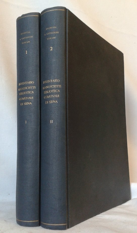 Due volumi in 4 grande, tela editoriale, titolo al dorso, sguardie, frontespizi, XII, 347, 349 pp, carte d'indici, carta d'errata. Importantissimo, ormai difficile da reperire, repertorio dei 346 manoscritti che sono conservati nella Biblioteca Comunale senese con una catalogazione precisa e raffinata, una descrizione sommaria ma puntuale, un resoconto notevolmente efficace. Nei due volumi sono presenti 14 tavole ft. illustranti alcuni fra i pi notevoli reperti catalogati. In perfetto stato, importanti