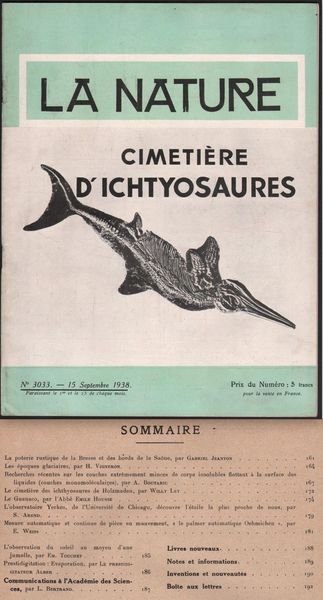 LA NATURE-CIMETIERE D'ICHTYOSAURES -N∞ 3033-15 SEPTEMBRE 1938. PP. 32 PIŸ' PP. 4 DI†PUBBLICIT¿. CM. 29 X 22. BELLA RIVISTA DI INIZIO SECOLO, TRATTA DI INVENZIONI TECNOLOGICHE,†AERONAUTICA, ARCHEOLOGIA, ASTRONOMIA E MOLTI ALTRI ARGOMENTI. RARA. BUONE CONDIZIONI QUALCHE MACCHIA ALLA COPERTINA.