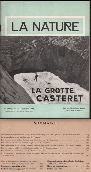 LA NATURE-LA GROTTE CASTERET -N∞ 3032-1 SEPTEMBRE 1938. PP. 32 PIŸ' PP. 4 DI†PUBBLICIT¿. CM. 29 X 22. BELLA RIVISTA DI INIZIO SECOLO, TRATTA DI INVENZIONI TECNOLOGICHE,†AERONAUTICA, ARCHEOLOGIA, ASTRONOMIA E MOLTI ALTRI ARGOMENTI. RARA. BUONE CONDIZIONI QUALCHE MACCHIA ALLA COPERTINA.COPERTINA PARZIALMENTE STACCATA