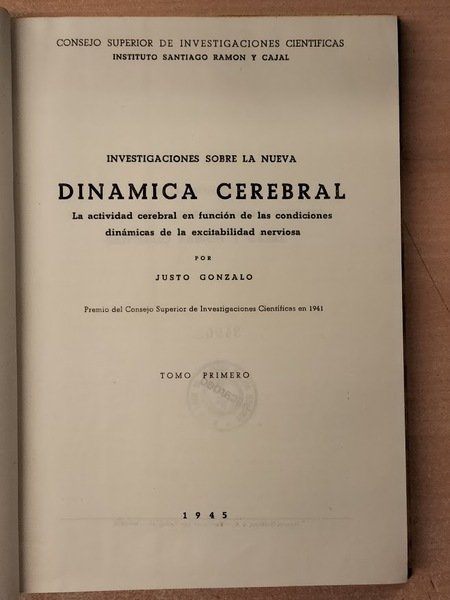Investigaciones sobre la nueva Dinámica Cerebral. La actividad cerebral en función de las condiciones dinámicas de la excitabilidad nerviosa. 2 Tomi. Premio del Consejo de Investigaciones Científicas en 1941.