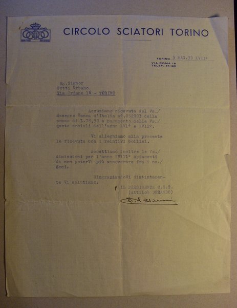 Invio su carta intestata CIRCOLO SCIATORI TORINO 1939 con firma Presidente Attilo Durando
