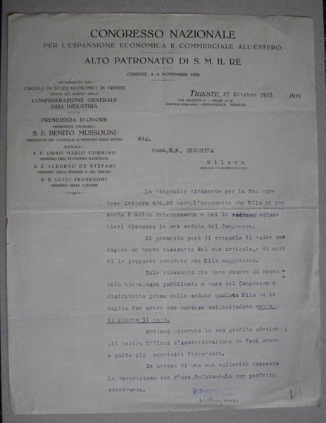 Invio su carta intestata "Congresso Nazionale espansione economica e commerciale.Alto Patronato S.M.il Re" 1923 TRIESTE
