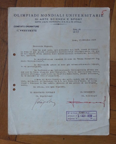 Invio su carta intestata Olimpiadi Mondiali Universitarie di Arte Scienza e Sport sotto l'alto patronato di S.M. il Re d'Italia. Con firma del Presidente e Segretario Generale.