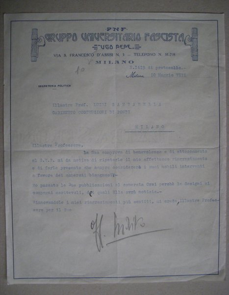 Invio su carta intestata "PNF Gruppo Universitario Fascista - Ugo Pepe MILANO" 1930 VIII