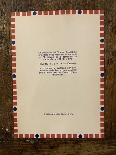 Invito 21 x 15 cm. per la proiezione del Film Precinetisme Cinema Arlecchino Milano 21 - 25 e 28 Aprile (1969)