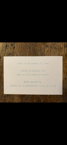 Invito 7 x 10,5 cm. all'esposizione dell'opera di René Magritte Esprit de la gèométrie Notte di Natale 1976 dalle ore 20 di venerdì 24 dicembre alla Galleria l'attico