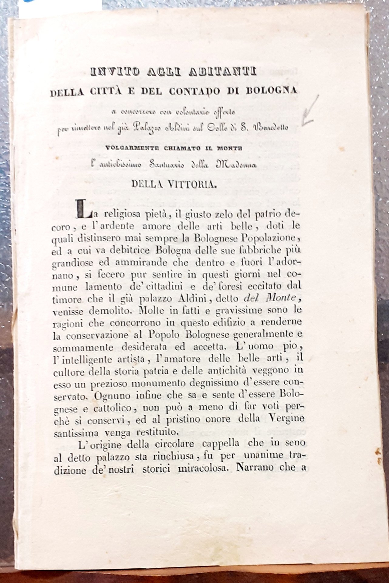 INVITO AGLI ABITANTI DELLA CITTA' E DEL CONTADO DI BOLOGNA a concorrere con volontarie offerte per rimettere nel già Palazzo Aldini sul Colle di S. Benedetto volgarmente chiamato il Monte L'Antichissimo Santuario della Madonna della Vittoria. (San Luca).,