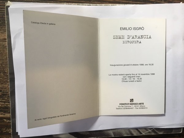 Invito ripiegato cm. 17 X 12 dell'Esposizione Seme d'arancia europera alla Galleria Fonte d'Abisso in Milano dall'8 ottobre al 14 novembre 1998