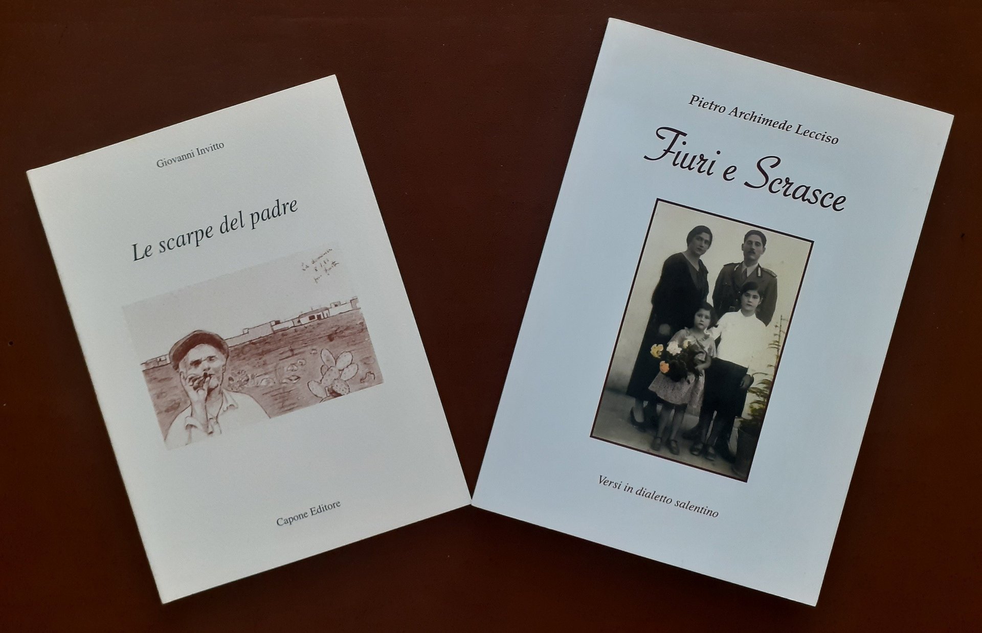 Giovanni Invitto, Le scarpe del padre, Capone Editore, Cavallino di Lecce 1994, pp. 32, ill. b.n., cm 21, br. ed. (Collana I crepuscolari, vol. 1). In lotto con: Pietro Archimede Lecciso, Fiuri e scrasce, a cura di Gabriella Manca, con un ricordo di Gianfranco Visconti, s.n., s.l. (ma stampato a Monteroni, presso la Tipografia Quarta) 2006, pp. 64, ill. b.n., cm 23, br. ed. Il lotto comprende due raccolte di poesie di autori salentini. Perfetti.