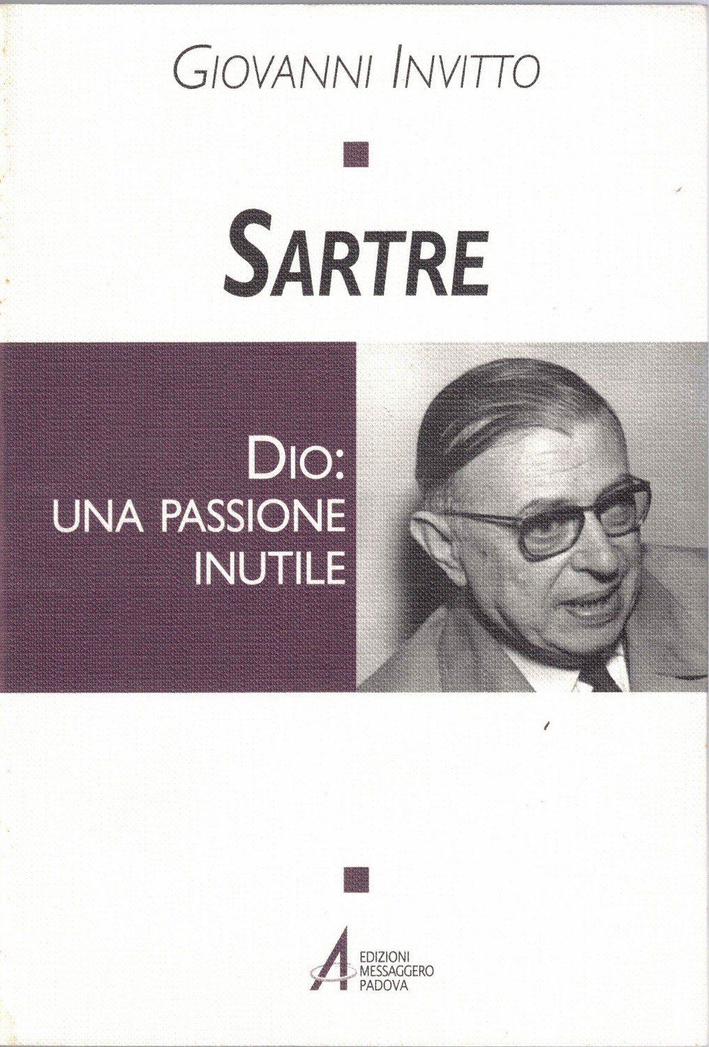 Giovanni Invitto, Sartre. Dio: una passione inutile, Edizioni Messaggero, Padova 2001, pp. 95, cm 21, br. ed. con alette. Collana Tracce del sacro nella cultura contemporanea, vol. 15. Indice: Premessa – Sartre, l’esistenzialismo e il problema del sacro – Il problema di Dio e dell’incarnazione, prima de L’Essere e il nulla – L’ateismo di Sartre nella fase dell’ontologia del nulla – Tra esistenzialismo e marxismo – Il problema di Dio negli ultimi anni di Sartre – Conclusioni – Indicazioni bibliografiche sui temi trattati – Note. Minime fioriture, lieve ingiallitura della carta, per il resto ottimo.