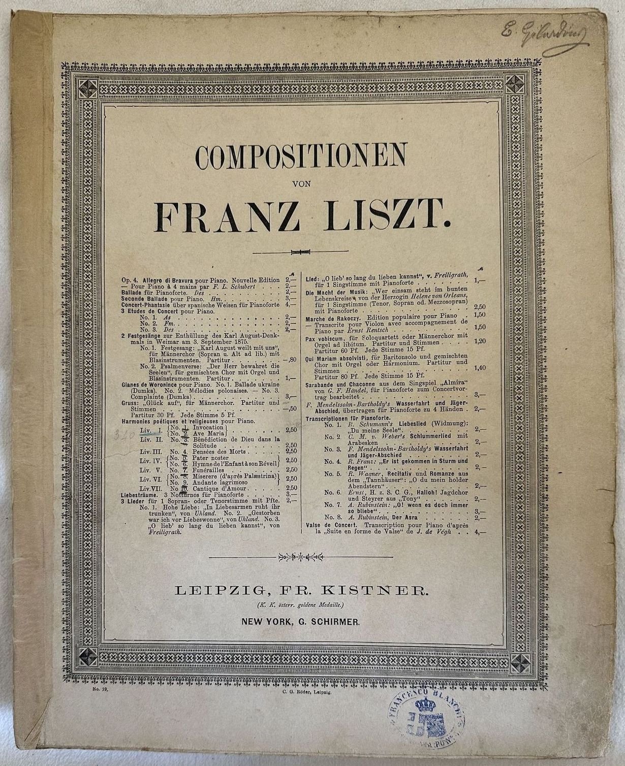 Edizione della fine dell'ottocento della melodia "Invocation" di Franz Liszt (1811-1886) di pianoforte. Decorazioni in copertina. In ottime condizioni. Copertina editoriale in buone condizioni con lievi usure marginali. Legatura editorialmente assente. Pagine in buone condizioni con rare fioriture. In Folio. cm. 34x27,5. Pp. 14.Edition of late 19th century of the melody "Invocation" by Franz Liszt (1811-1886). Decorations in the cover. In very good conditions. Editorial cover in good conditions lightly worn in the extremities. Binding editoriarly lacks. Pages in good conditions with occasional foxing. In Folio. cm. 34x27,5. Pp. 14.