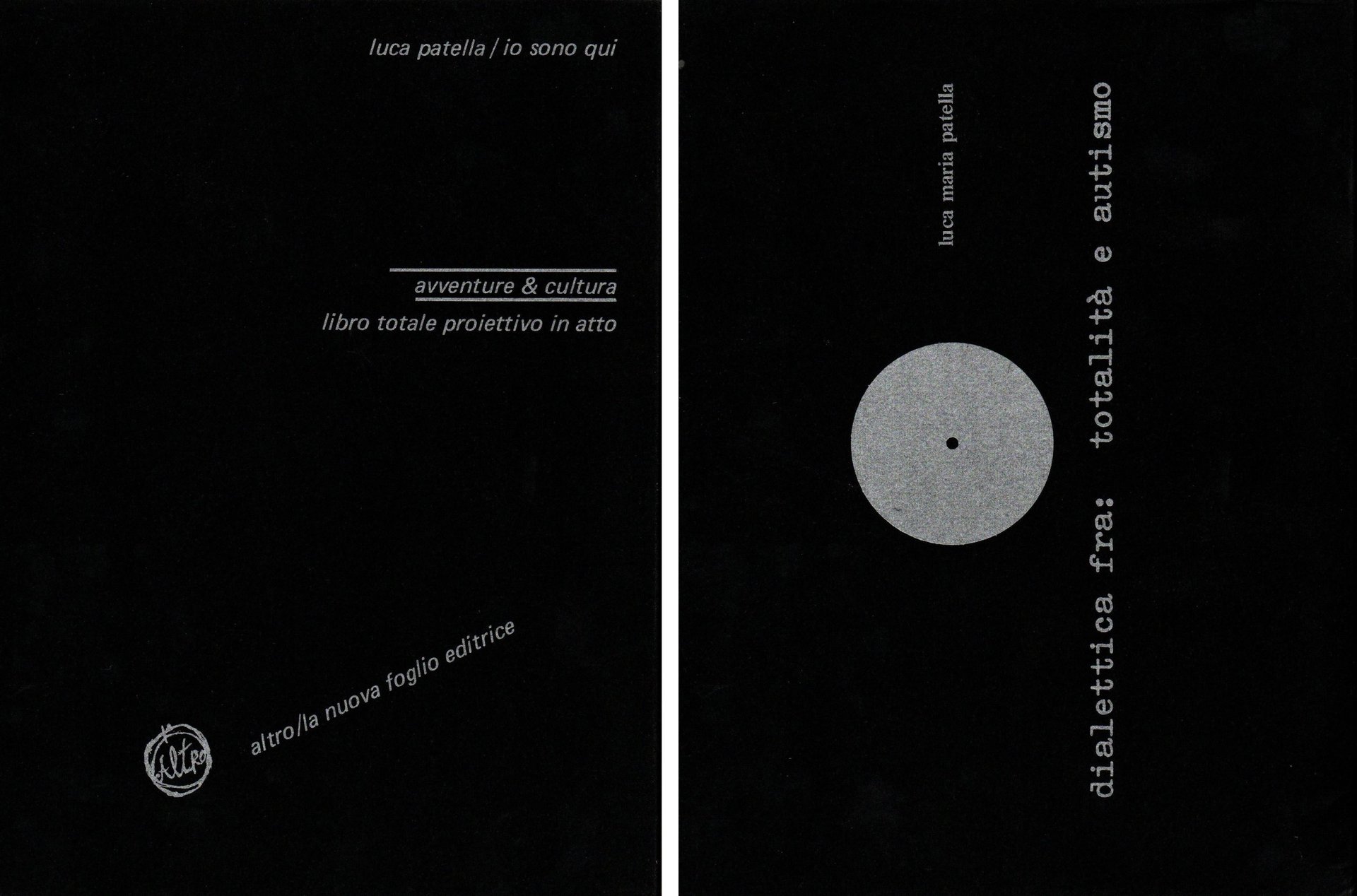 Libro d'artista. Legatura editoriale cartonata, alla sovraccoperta titolo e sottotitolo in argento difformi dal frontespizio, "Libro totale proiettivo in atto", al piatto posteriore una composizione verbovisuale "Dialettica fra: totalità e autismo". Volume della collana "Altro" a cura di Magdalo Mussio, introduzione di Renato Barilli ("Il libro totale di Patella"), testi e illustrazioni anche su carte colorate, opere riprodotte in B/N anche a piena pagina, testi manoscritti e dattiloscritti in facsimile. In eccellente stato. € 150,00