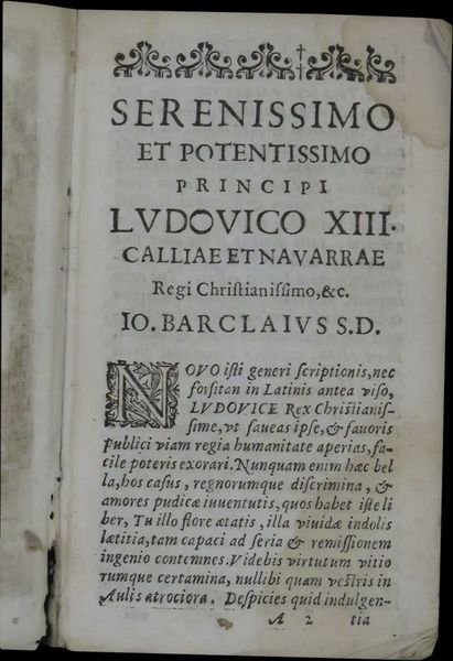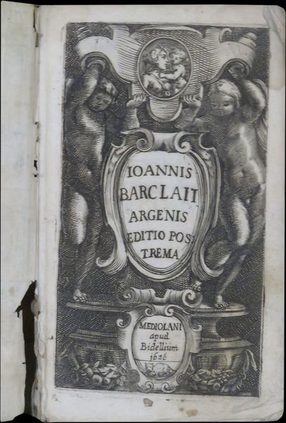 In 8° piccolo (14×8 cm); 647, (37) pp. Legatura coeva in piena pergamena molle con titolo manoscritto al dorso su pecetta settecentesca. Qualche lieve segno del tempo, un leggerissimo alone, praticamente invisibile, al margine alto ed esterno di alcune pagine e nel complesso, esemplare in buone condizioni di conservazione. Bellissimo frontespizio inciso con nel margine basse la marca tipografica di Giovanni Battista Bidelli, gatto con in bocca un topolino che riprende la marca tipografica cinquecentesca di Giovanni Battista Sessa. Bell'edizione milanese stampata da Bidelli di questa classica opera del celebre poeta, scrittore e satirista scozzese di orientamento cattolico, John Barclay, anche noto in italiano come Giovanni Barclays e in francese come Jean Barclay (Pont-à-Mousson, 28 gennaio 1582 - Roma, 15 agosto 1621). Barclay visse a lungo a Roma all'interno dello stato pontificio. A Roma morì nel 1621 ed è tutt'oggi sepolto nella Chieda di Sant'Onofrio al Gianicolo. Figlio di un noto giurista cattolico appartenente alla piccola nobiltà, in giovane età scappò in Francia dopo il fallimento cattolico del tentativo d'usurpazione della corona Inglese. A diciannove anni scrisse la sua prima opera di un certo rilievo, un commento alla Thebais di Stazio. Alla morte di Elisabetta I, Giacomo VI restituì i beni confiscati antecedentemente ai cattolici e la famiglia di John rientrò in Inghilterra e qui risedette per alcuni anni prima di spostarsi nuovamente in Francia, dove, il giovane autore ottenne una cattedra di Diritto che gli permise di dedicarsi con tranquillità alla composizione letteraria. Entrato nella cerchia ristretta degli amici di Giacomo VI divenne frequentatore abituale della corte inglese. I suoi componimenti erano sempre pervasi di una forte verve satirica che lo portò più volte al centro di sferzanti polemiche. Nel 1616 si trasferì a Roma dopo che Papa Paolo V gli concesse benevolenza e protezione. Qui frequentò il mondo politico e letterario della capitale italiana stringendo una fraterna amicizia con Maffeo Barberini, il futuro Papa Urbano VIII. A Roma compose quella che è considerata una delle sue opere principali, l'Argeneide un'allegoria del conflitto religioso che vide contrapposti in Francia, Enrico III e Enrico IV che portò a diversi conflitti religiosi e politici come lo scandalo di Overbury. Di posizione realista, l'opera è chiaramente un invettiva anti-aristocratica dove il Re riduce il potere della nobiltà terriera a favore dell'interesse del "paese" che si incarna a sua volta nella figura stessa del re. L'opera, uscita per la prima volta nel 1621, ebbe uno straordinario successo e numerose edizioni in pochissimo tempo. Rif. Bibl.: IT\ICCU\CAGE\022827.
