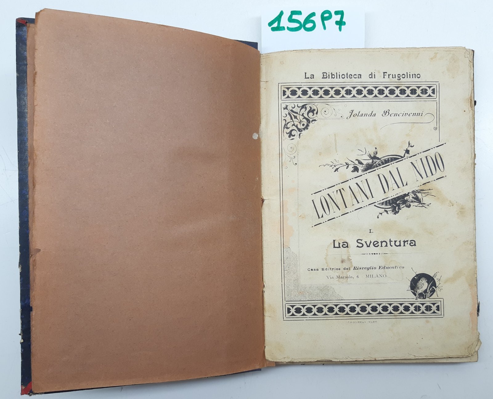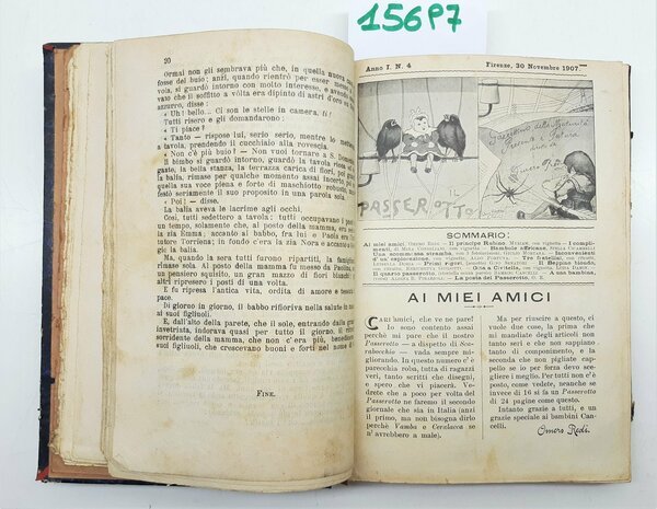legatura rigida in mezza tela con piatti marmorizzati in condizioni accettabili con segni del tempo e abrasioni all'unghia, dorso in tela blu con etichetta di catalogazione alcuni aloni e scoloriture, tagli bruniti impolverati quelli superiori, fogli di guardia colorati, alla seconda di copertina ex libris, all'interno: La biblioteca del frugolino Iolanda Bencivenni "lontani dal nido" I parte e "uccellino in gabbia" II parte : manca la legatura editoriale, frontespizio in condizioni accettabili con fioriture e macchie diffuse, vedere immagini, margini delle pagine irregolari, fioriture alle pagine interne, seconda parte con margine inferiore di dimensioni ridotte rispetto alle altre pagine, frontespizio della seconda parte con uno strappo al margine inferiore di circa cm 3, vedere immagine numero pagine 20 + 20, il libro contiene anche una raccolta de Il Passerotto Gazzettino della maturit‡ presente e futura diretta da Omero Redi numeri: Anno I n. 4 1907 Anno II 1908 n. 1, 2, 3, 4, 5, 6, 7, 8, 9, 10, 11-12, manca la legatura editoriale testo su due colonne, fioriture e aloni diffusi alle pagine interne, vedere immagini, ogni fascicolo Ë di 16 pagine una piega al margine esterno dal fascicolo numero 5 al termine del libro, dimensioni cm 20,3 per 14,5