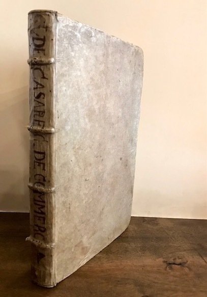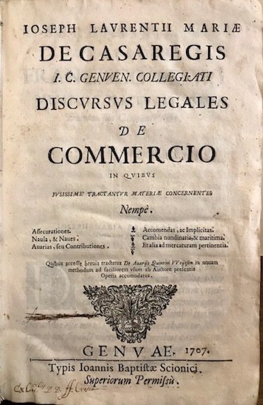 Folio (cm. 32), 9 cc.nn., 320 pp., 57(1) pp. Iniziali e fregi xilografici n.t. Testo su due colonne. Legatura coeva in pergamena rigida con titolo ms. in grandi caratteri al ds. (lievi tracce d’uso). Antico ex libris ms. al piede del frontespizio. Esemplare in ottimo stato di conservazione. Rara edizione originale. Celebre giurista, il Casaregi (1670-1737) è considerato uno dei fondatori del diritto commerciale moderno. I ‘Discursus legales de commercio’, che sono la sua opera principale, appaiono come il frutto dell’attività legale, come avvocato e come giudice, svolta prima a Genova e poi a Firenze. I cinquanta ‘Discursus’ presenti in questa edizione originale trattano temi mercantili proponendo una serie di casi pratici soprattutto in materia di cambi e di assicurazioni. Edizioni successive in Sapori (pp. 114-115). Non in Einaudi.