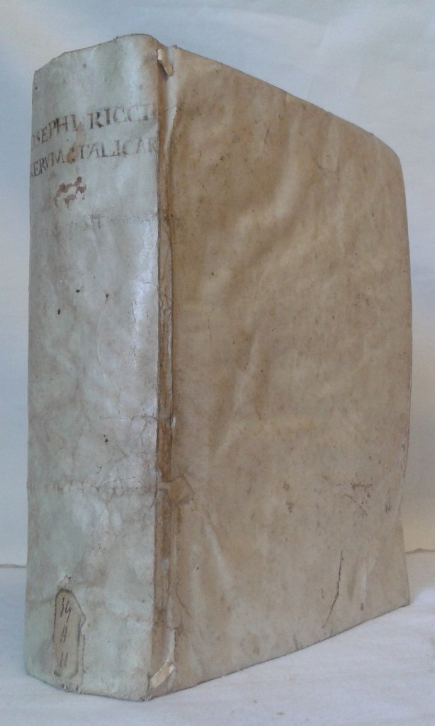 Volume in 4 antico legato in pergamena, titolo calligrafato al dorso, sguardie, frontespizio con ampia marca tipografica, 10 carte, 906 pp., errori nell'indicazione della segnatura; manca l'antiporta allegorica incisa in rame, con personaggi, animali, simboli di varie citt. Ad opera del monaco somasco bresciano Ricci, questo dettagliatissimo resoconto delle guerre del tempo, preceduto da interessante 'Index latina antiqua nomina suis quibusque locis', dove apprendiamo che le Langhe sono 'Clitellae', e distinguiamo tra 'Nicia', Nizza della Paglia, e 'Nicaea', Nizza Marittima; trattazione che privilegia particolarmente il territorio piemontese tra Langhe, Monferrato, Cuneese; la guerra del Monferrato; la guerra di Carnia e del Friuli; le guerre liguri; i tre assedi di Casale; le guerre tra Torino e vari altri stati, italiani ed esteri, le guerre civili tra madamisti e principisti; e lotte in Cremona, Tortona, negli stati pontifici, le insurrezioni di Palermo. Innumerevoli riferimenti a minuscole localit del Cuneese quali Cherasco, Carr, Garessio, Bagnasco; citazione in pi passi di Mondov e delle sue vicende belliche. Superba descrizione, che occupa due pagine di testo, della citt di Cuneo, in quanto piazzaforte militare e strategica della massima importanza, ma anche sotto il profilo paesaggistico, splendido l'incipit: 'Cuneum duo cadentia ex Alpibus flumina in arctum.', segue la descrizione di 'Ghezium' e 'Sturiae'. Fatta salva la mancanza dell'antiporta e due piccoli strappi in due carte, in pi che bello stato, di scarsissima reperibilit.