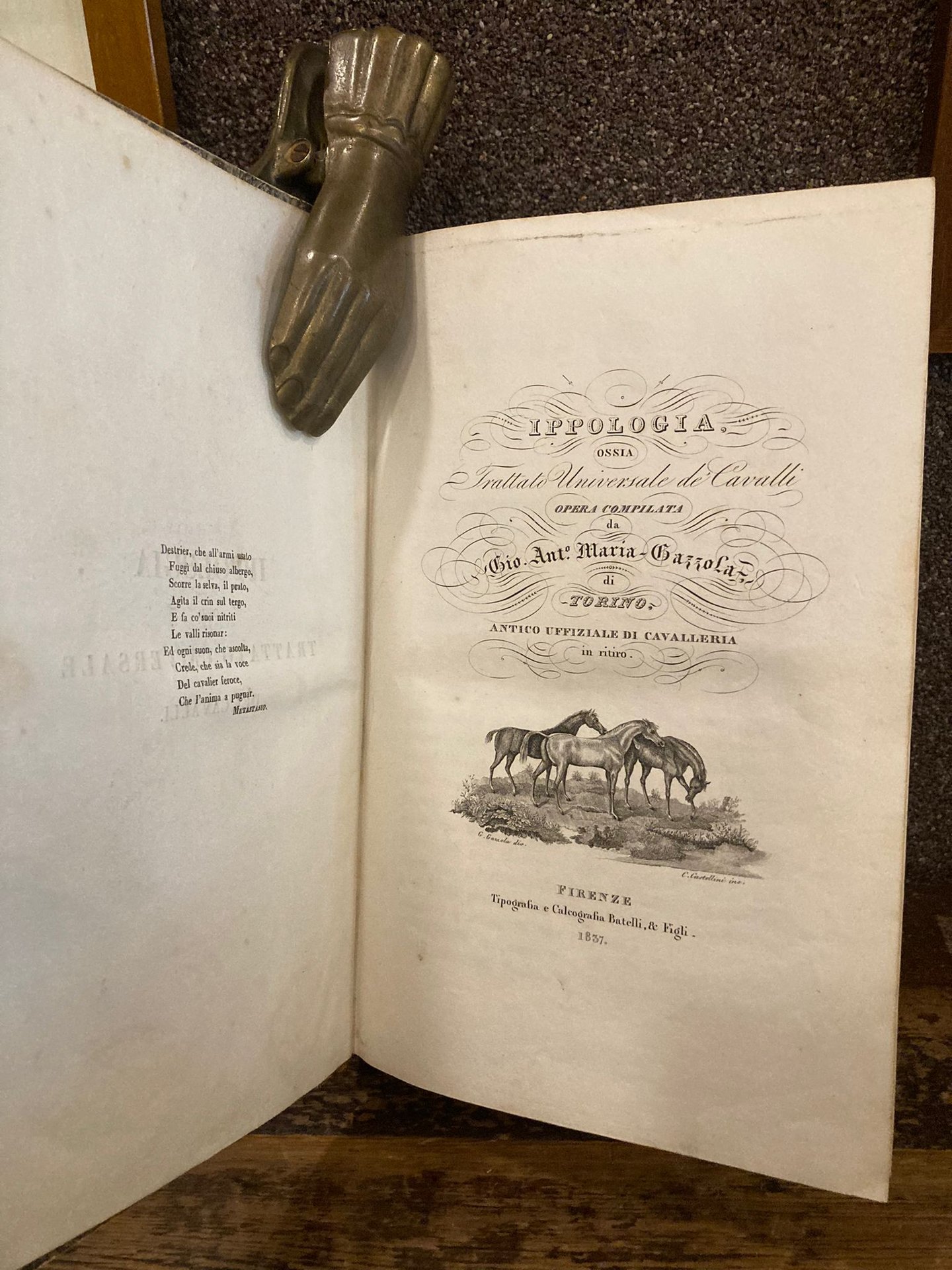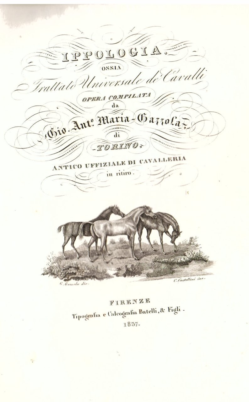 In-8° (252x165mm), pp. 576, legatura coeva m. pelle con titolo e decori in oro al dorso e piatti marmorizzati. Frontespizio inciso su acciaio con titolo entro svolazzi calligrafici e vignetta con tre cavalli incisa da Castellini da invenzione di Gazzola stesso. 37 tavole litografiche in b.n. f.t. (ne esiste anche una più pregiata tiratura con le tavole a colori) incise da Verico, Batelli, Migliavacca, ecc. da invenzione dell'autore. Le tavv. 19-20 sono accorpate in un unico foglio, le tavv. 25 e 30 sono ripiegate. Le tavv. 31-32 risultano posposte. Fioriture usuali, piccoli restauri al dorso. Bell'esemplare. Prima edizione, rara a trovarsi completa, di questa enciclopedica trattazione su ogni possibile aspetto dell'ippologia, dall'anatomia e fisiologia del cavallo alla medicina veterinaria, dalla mascalcia all'alimentazione, dall'equitazione alle curiosità sugli equini. Niccoli, p.558. Podeschi, 154. Wells, 2779.