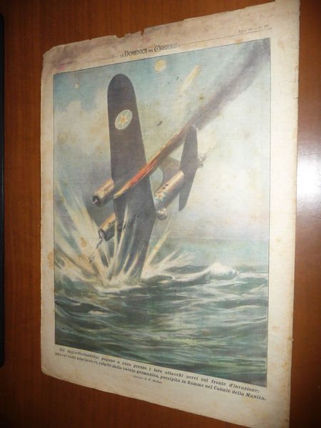 DESCRIZIONE: Domenica del Corriere, Milano, Anno 46 n. 33 (13 Agosto 1944-XXII). COPERTINA: "Nelle montagne dell'Abruzzo e della Sila, nello Spoletano e in Maremma il movimento di resistenza nazionale intensifica le sue azioni contro gli invasori: presso Paola (Calabria), in un audace attacco, un gruppo di trecento irredentisti annienta una numerosa colonna di fanteria canadese e di artiglieria polacca." (dis. A. Beltrame). RETRO: "Gli Anglo-Statunitensi pagano a caro prezzo i loro attacchi aerei sul fronte d'invasione: uno dei tanti plurimotori, colpito dalla caccia germanica, precipita in fiamme nel Canale della Manica." (dis. A. Beltrame). CONDIZIONI: Accettabile. Con spille, senza sovraccoperta, molti strappetti, pieghe e macchie. PESO / WEIGHT: 100 gr. without package