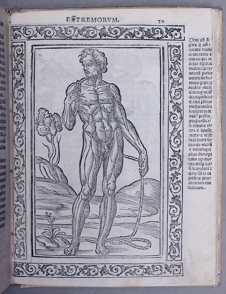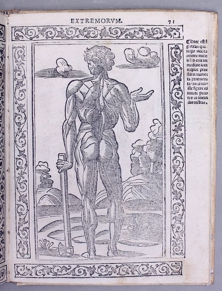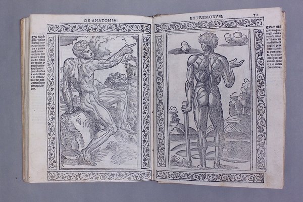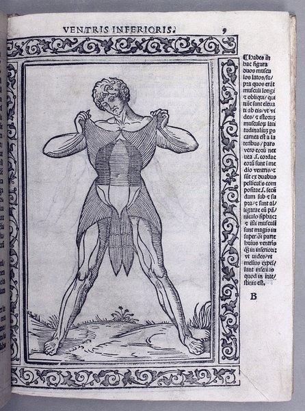 “Berengario was the first anatomist to publish illustrated treatises on anatomy based on his own dissections. His Commentaria on the fourteenth-century Anatomia of Mondino was the first work since the time of Galen to display any considerable amount of original anatomical information based upon personal investigation and observation. The woodcut illustrations of muscle men posed before a landscape background in this work, while crude and lacking in detail in comparison to those in Vesalius’s Fabrica, represent the model on which Vesalius based his series of larger and more scientifically portrayed muscle men…” (Norman catalogue, nota ai Commentaria).