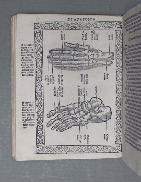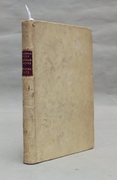 In-4°; 80 carte: titolo inquadrato in elegante bordura architettonica xilografica con al piede l'immagine di Berengario, circondato dai suoi studenti, intento ad una dissezione e 23 illustrazioni anatomiche incise in legno a piena pagina, circondate da una bordura ornamentale. Legatura in tutta pergamena settecentesca (rimontata). Esemplare con margini contenuti (19,2x14,2) dove, a causa della maggior giustezza delle carte di tavole, il taglio provoca in qualche caso una millimetrica perdita della bordura inferiore, e in tre occasioni, di qualche lettera delle note esterne alla bordura. Ad una porzione bianca del titolo è applicato anticamente un cartesino con il nome manoscritto Gilius Ignatius, probabile primo proprietario del volume.