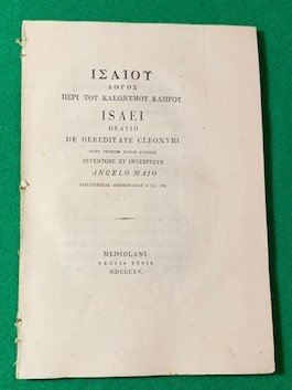 In 8°; 67, (1) pp. Senza legatura ma non slegato e a parte questo in ottime condizioni di conservazione. Edizione non comune di quest'opera del celebre oratore e logografo ateniese, Iseo (Calcide, 420 a.C. circa - Atene, 340 a.C. Circa). Questa edizione venne poi ripresa a Lipsia nel 1829. Edizione con l'interpretazione del famoso filologo, teologo, insegnante, sacerdote, nominato primo custode della Biblioteca Apostolica Vaticana (1819-1833), cardinale e segretario della S. Congregazione di Propaganda Fide, Angelo Mai (1782 Schilipario in provincia di Bergamo - 1854 Albano). Testo greco e latino. Prima edizione nella versione curata da Angelo Mai. Rif. Bibl.: IT\ICCU\RMSE\004988.