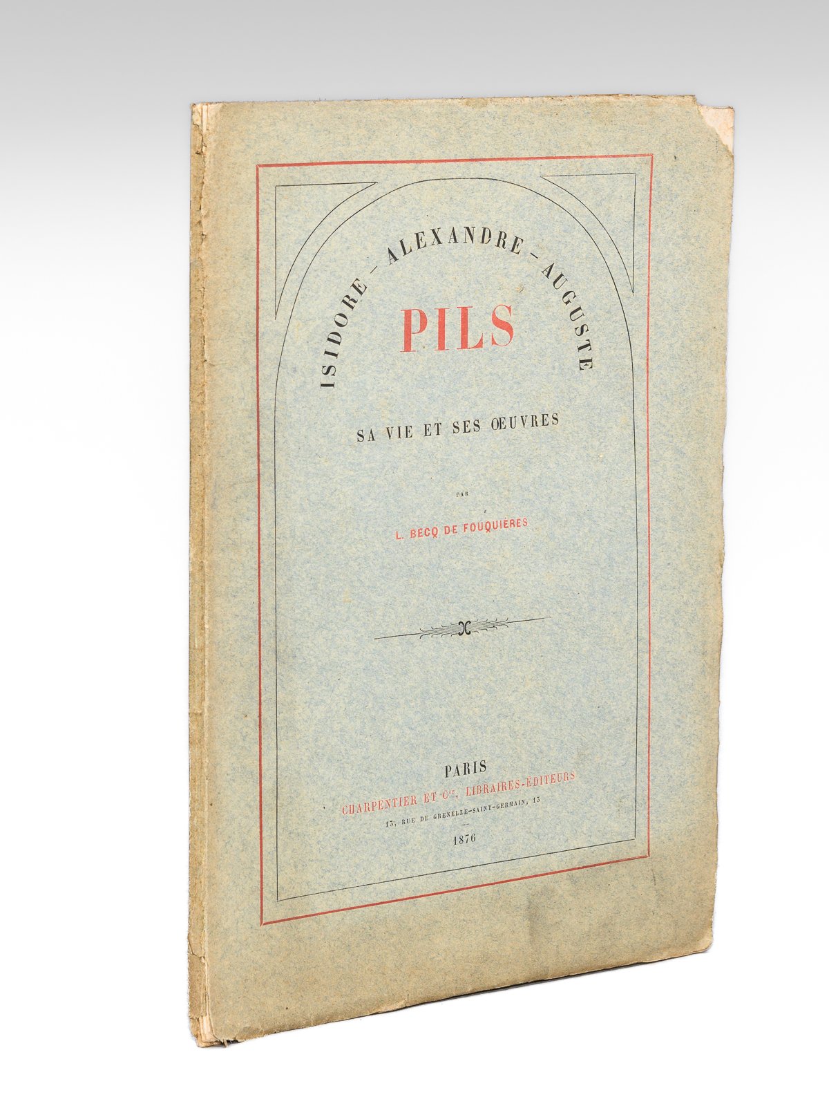 1 vol. grand in-8 br., Charpentier et Cie, Paris, 1876, 2 ff., 58 pp. et 1 f. n. ch. Rare exemplaire de cette étude qui se termine sur un catalogue des oeuvres principales du peintre Isidore Pils (1815-1875). Etat très satisfaisant (petits mq. en couv., bon état par ailleurs).