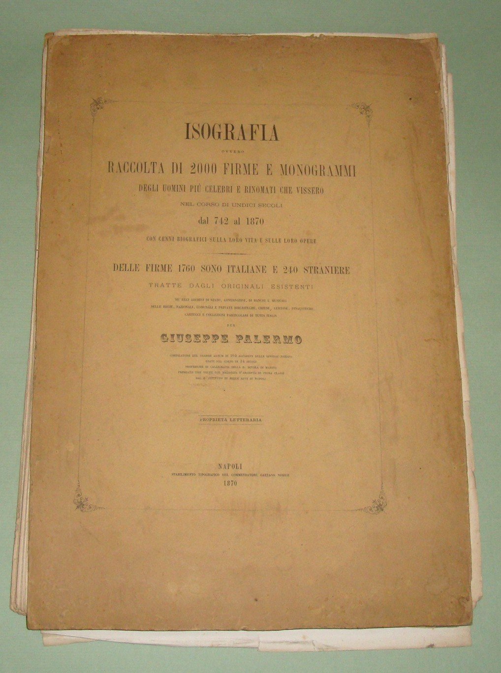 Delle firme 1760 sono italiane e 240 straniere tratte dagli originali esistenti. Napoli, Nobile, 1870. In folio; pp.78, 2n.nn., 12, 2n.nn. e 44 tavole incise in rame a piena pagina che riproducono le firme suddivise nelle diverse categorie. Cart. editoriale. Esemplari a fogli sciolti, lievi fioriture a qualche tavola. Edizione pregevole ed importante per il riscontro e le consultazioni. Il Palermo raccolse e disegnò tutta l'opera e Giovanni Fusaro eseguì le incisioni. Bonacini, 1349.