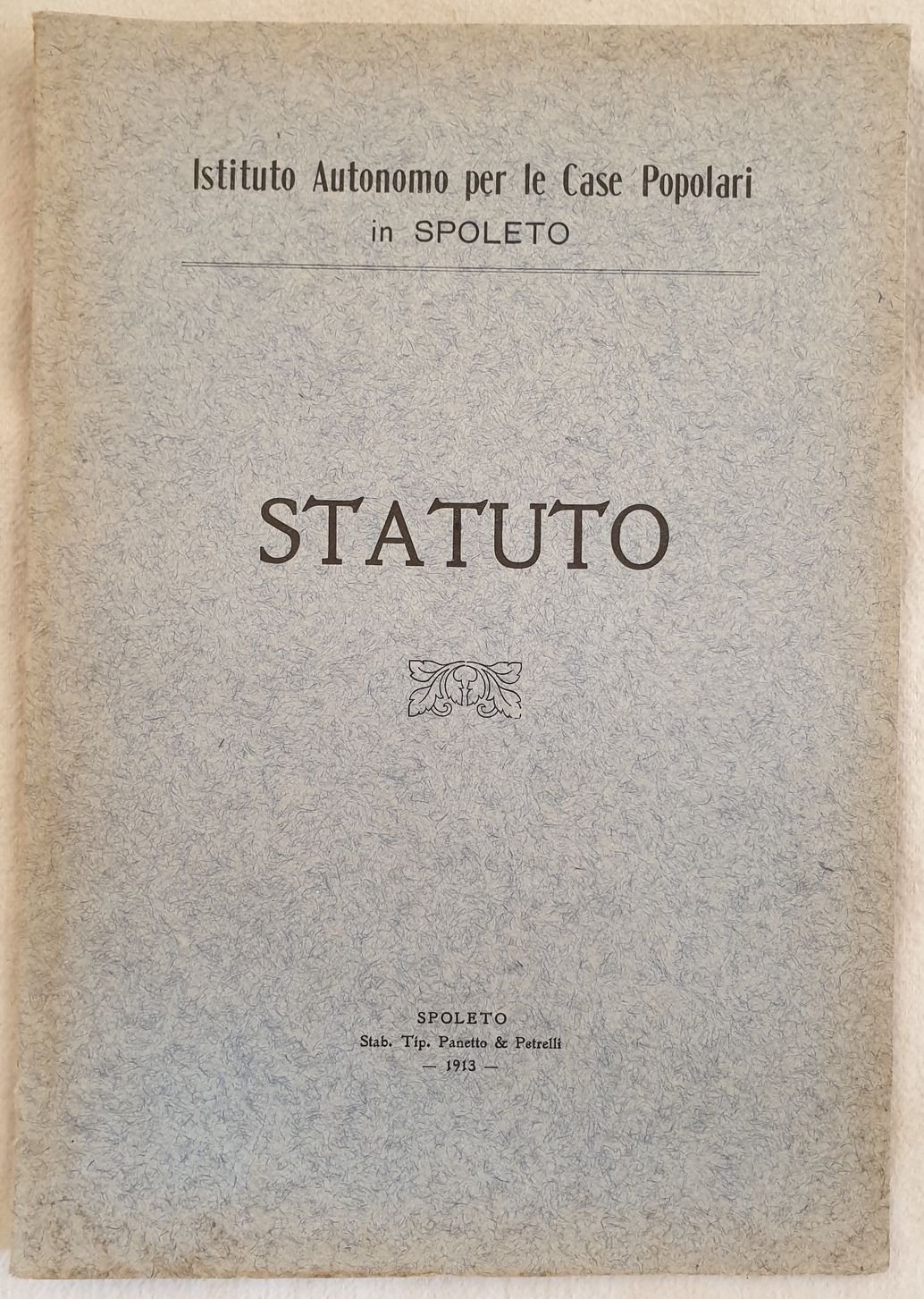 Edizione del 1913 dello statuto per l'"Istituto Autonomo per le case popolari" in Spoleto. In ottime condizioni. Copertina editoriale in ottime condizioni generali con lievi usure ai margini e dorso. Legatura in ottime condizioni. All'interno le pagine si presentano in ottime condizioni con rare fioriture. In 8. Dim. 24,5x17 cm. Pp. 28. Edition of 1913 of statuto per l'"Istituto Autonomo per le case popolari" in Spoleto. In very good conditions. Editorial cover in very good general conditions slightly worn in the edges and spine. Binding in very good conditions. Pages in very good conditions with occasional foxings. In 8. Dim. 24,5x17 cm. Pp. 28.