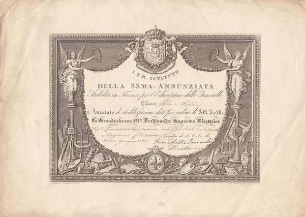 Attestato di soddifazione dato per ordine della Granduchessa Ma. Ferdinanda Suprema Direttrice alla Signorina Poniatowski datato Firenze Giugno 1852 formato 30X21 cm circa; buon es.