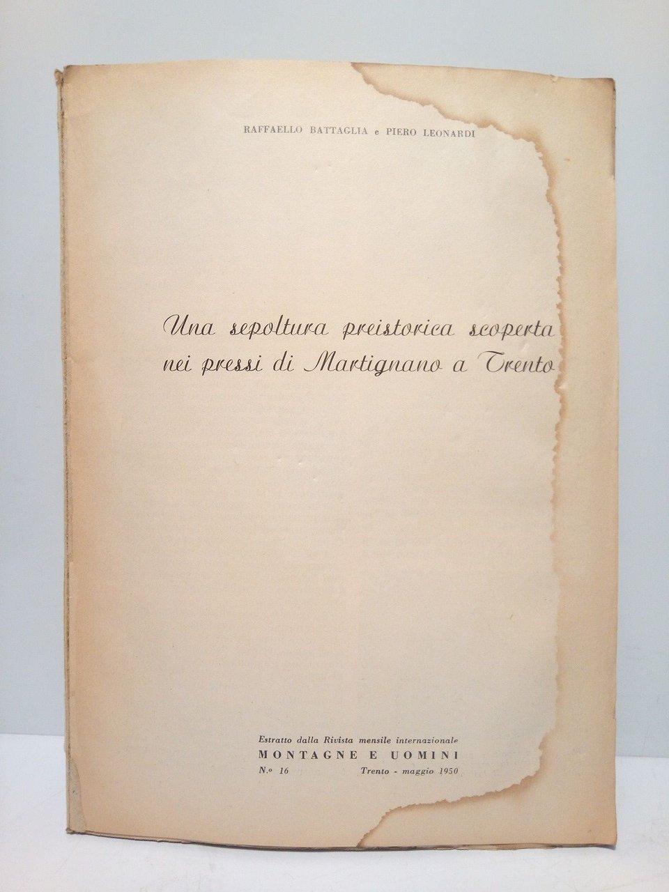 Trento - Ferrara: Istituto Ferrarese de Paleontologia Humana, 1949-50.- 6 separatas ([2 h.]; 20 p.; 7 p. + [3 h.]; [4 h.]; 3 p. + [3 h.]; 25 p. respectivamente para cada una): Láminas; 4º (24,9 x 18 cm); Texto en italiano; Rústica Ed.- Se trata de una recopilación de separatas de diversas publicaciones, a saber: Una sepoltura preistorica scoperta nei pressi di Martignano a Trento, por Rafaello Battaglia y Piero Leonardi (sep. de la revista "Montagne e Uomini", n.º 16, Trento 1950); Nuove serie di petroglifi della Val Camonica, por Piero Leonardi (sep. de los "Annali della Università di Ferrara", Vol. 8, Ferrara 1950); Notizie preliminari sul castelliere del Dos Zelòr presso Castello in Val di Fiemme (Trentino), por Piero Leonardi (sep. de "Cultura Atesina", n.º 2, 1949); Seconda campagna di scavo nelle Grotte dei Berici (Vicenza). Due nuovi depositi di interesse paleontologico e paletnologico: La Grotta A. da Schio e la Grotta G. Perin, por Piero Leonardi (sep. de la "Rivista di Scienze Preistoriche", Vol. 4, Fasc. 3-4, 1949); Notizie preliminari sui risultati della campagna di scavo compiuta sul Dos Zelòr presso Castello di Fiemme nel 1949, por Piero Leonardi; I Foraminiferi Tirreniani della Barma Grande, por Bruno Accordi (sep. de los "Annali della Università di Ferrara", Vol. 8, Ferrara 1950).- Interesante y raro conjunto de trabajos.* Primeras dos hojas manchadas de humedad en los márgenes. PALEONTOLOGÍA, PREHISTORIA Y PROTOHISTORIA