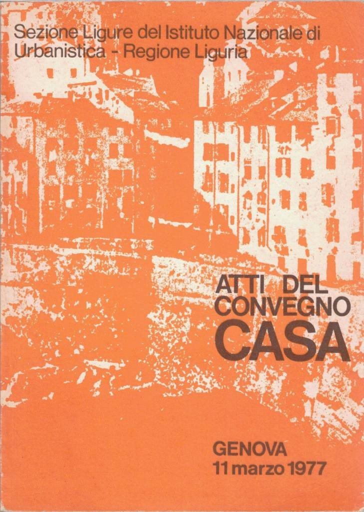 Istituto Nazionale di Urbanistica – Sezione Liguria, Atti del Convegno Casa. La politica della casa in Italia e in Liguria: condizionamenti storici, linee e prospettive di riconversione. Genova, 11 marzo 1977 Palazzo Doria Spinola – Salone del Consiglio Provinciale, s.n., s.l. s.d. (1977?), pp. 142, 3 c. di tavv. ill. col., cm 22, br. ed. Relazioni: R. Beggiato, Linee di una politica regionale per la casa - F. Indovina, L'edilizia nell'attuale crisi economica: il risultato di trent'anni di "politica della casa" e provvedimenti in corso (suoli, equo canone e piano pluriennale) - G. Rota, Fabbisogni e disponibilità finanziarie per la politica della casa - A. Bastianni, L'operatore privato - L. Barone, L'operatore pubblico - R. Repetti, Il movimento cooperativo - G. Spalla, Politica della casa e politica del territorio: riuso del patrimonio edilizio e riequilibrio territoriale in Liguria - P. Rigamonti, L'edilizia residenziale pubblica in Liguria: bilancio e prospettive dei piani di zona - G. Moras, La politica degli Enti locali: bilanci e prospettive di programmazione e di intervento. Lievi segni del tempo alla brossura, per il resto esemplare ben conservato. Rarissimo.