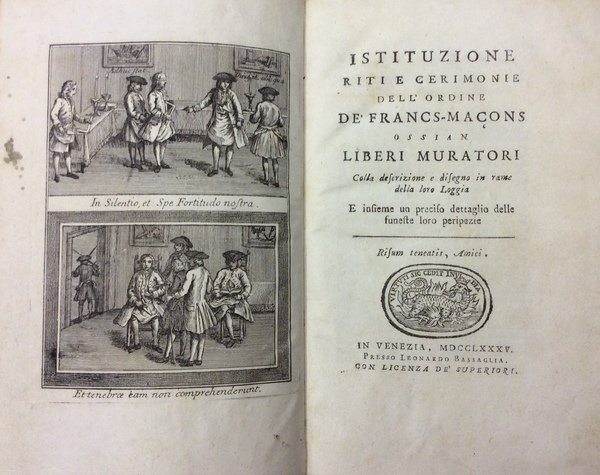In-8 p. (mm. 210x130), mz. pergamena coeva, titolo oro su tassello al dorso, pp. 95, marca tipografica xilografata al frontespizio, con 7 belle tavole inc. in rame e fuori testo, di cui una all'antiporta, rappresentanti le loro Logge, emblemi, ecc.Cfr. Lattanzi Bibliografia della Massoneria Italiana,770/b: "Libro anonimo che, mettendo in burletta la Istituzione sul frontespizio, ne trattava, nel testo, in modo non avverso, quasi a disporre in suo favore l'opinione pubblica, per svelenirla dall'ondata di odio che aveva prodotto la teatralità dell'avvenimento" (la scoperta di una Loggia a Venezia)" - Simoni,1528(b) - Benimeli,218.Esemplare ben conservato.