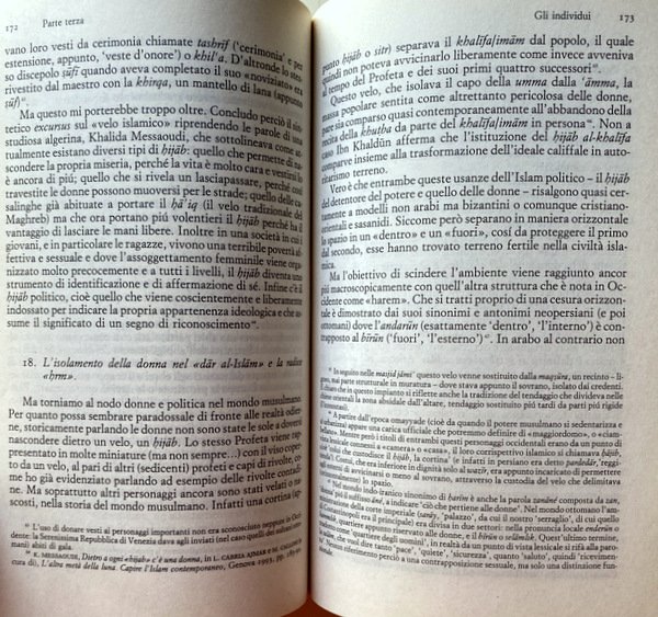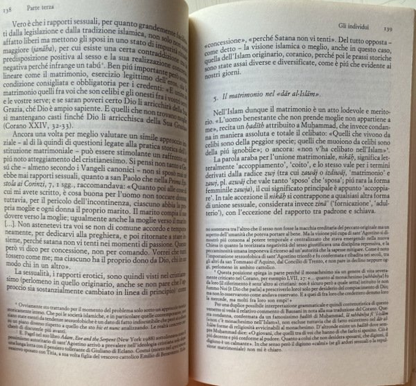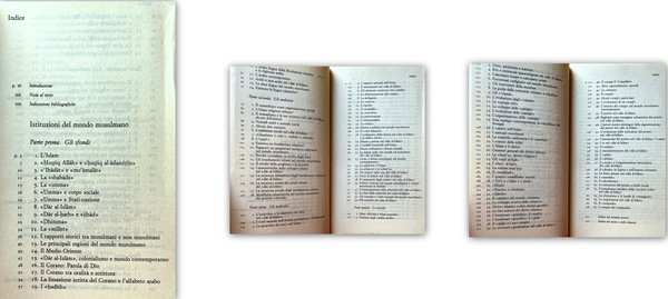 Soggetti: Islam, Mondo islamico, Diritto, Storia contemporanea, Filosofia, Religione, Religioni, Paesi, Popoli, Arabi, Musulmani, Fede, Istituzioni, Fede, Legge coranica, Società civile, Maometto, Profeta, Pellegrinaggio, Luoghi sacri, Jihad, Guerra, Awq, Harem, Lussuria, Pregiudizio occidentale, Relazioni internazionali, Scontro di civiltà, Preghiera, La Mecca, Donne, Famiglia, Monogamia, Poligamia, Patriarcato, Schiavitù, Diritti civili, Elemosina, Solidarietà, Riti, Rituali, Digiuno, Ebraismo, Ebrei, Andrea Alpago, Avicenna, Numeri arabi, Cristianesimo, Cristiani, Iran, Afghanistan, Pashtun, Sharia, Legge divina, Omosessualità, Mogli, Matrimonio, Nikah, Terrorismo, Radicalismo, Velo, Burqa, Ribellioni, Tribù, Nomadismo, Umayyadi, Dar alislam, Pax mongolica, Ottomani, Impero ottomano, Persiano, Civiltà indoislamica, India, Pakistan, Globalizzazione, Cinque pilastri, Ideologia sociale, Abbasidi, Sunniti, Turchia, Yemen, Iraq, Califfato, Califfi, Baghdad, Malaysia, Medina, Spagna, Cordova, Sciiti, Fedeli, Arte, Miniature, Moschea, Conquista, Rivelazione, Potere, Teocrazia, Venezia, Crociate, Gerusalemme, Terra Santa, Israele, Palestina, Nord Africa, Secolarizzazione, Separazione, Poteri, Città, Studi culturali, Mentalità, Evoluzione, Fondamentalismo, Saggistica, Riferimento, Bibliografia, Consultazione, Libri Vintage Fuori catalogo, Shahada, Testi sacri, Umma, Ibadat, Dhimma, Medio Oriente, Colonialismo, Corano, Alfabeto arabo, Hadith, Zanj, Rivolte contadine, Struttura urbanistica, Sviluppo urbano, Ruoli sessuali, Gerarchie, Nikah, Ripudio, Harem, Concubine, Prostituzione, Zina, Muhallil, Modelli femminili, Isolamento, Emancipazione, Eunuchi, Cerimonie, Penitenza, Martirio, Tariqa, Ulama, Sufi, Comunità islamiche, Sanità, Santi, Santuari, Usul-al-Fiqh, Hyal, Shurut, Shurta, Qanun, Diritto islamico, Funzionari giuridici, Qadi, Shurta, Waqf, Sultano, Diwan, Adab, Sultan, Mammelucchi, Mamluk, Devshirme, Wazir, Corporazioni, Emarginati, Muhtasib, Dinastie, Termini tecnici, Lingue parlate, Oralità, Scrittura, Alessandro Bausani, Teobaldo Filesi, Franco Gatti, Tiziano Bonazzi, Aldo Aldonico, Paolo Delogu, Sarnelli Cerqua, Endress, Lapidus, A. D'Emilia, Imam, Amir, Hadith, Baraka, Fay, Futuwwa, Fatwa, Hammam, Haram, Halal, Hudud, Iqta, Khalifa, Madhhab, Muftì, Ramadan, Shaykh, Shia, Salat, Tariqat, Sunna, Wazir, Zakat, Akbar, Alì, Fatima, Husayn, Omayyadi, Sulayman, Solimano, Letteratura, Islam, Islamic world, Law, Contemporary history, Philosophy, Religion, Religions, Countries, Peoples, Arabs, Muslims, Faith, Institutions, Faith, Koranic law, Civil society, Mohammed, Prophet, Pilgrimage, Sacred places, War, Lust, Prejudice Western, International relations, Clash of civilizations, Prayer, Mecca, Women, Family, Monogamy, Polygamy, Patriarchate, Slavery, Civil rights, Alms, Solidarity, Rites, Rituals, Fasting, Judaism, Jews, Christianity, Christians, Divine law, Homosexuality, Wives, Marriage, Terrorism, Radicalism, Veil, Rebellions, Tribe, Nomadism, Ottomans, Ottoman empire, Persian, Indo-Islamic civilization, Globalization, Five pillars, Social ideology, Abbasids, Sunnis, Turkey, Caliphate, Caliphs, Spain, Cordoba, Shiites, Faithful, Miniatures, Mosque, Conquest, Revelation, Power, Theocracy, Venice, Crusades, Jerusalem, Holy land, Israel, Palestine, Secularization, Separation, Powers, Cities, Cultural studies, Mentality, Evolution, Fundamentalism, Non-fiction, Reference, Bibliography, Consultation, Out of print books, Sacred texts, Middle East, Colonialism, Koran, Arabic alphabet, Peasant revolts, Urban structure, Development, Sexual roles, Hierarchies, Repudiation, Concubines, Prostitution, Female models, Isolation, Emancipation, Eunuchs, Ceremonies, Penance, Martyrdom, Islamic communities, Health, Saints, Shrines, Law, Legal officers, Mamelukes, Corporations, Outcasts, Muhtasib, Dynasties, Technical terms, Languages spoken, Orality, Writing, Literature