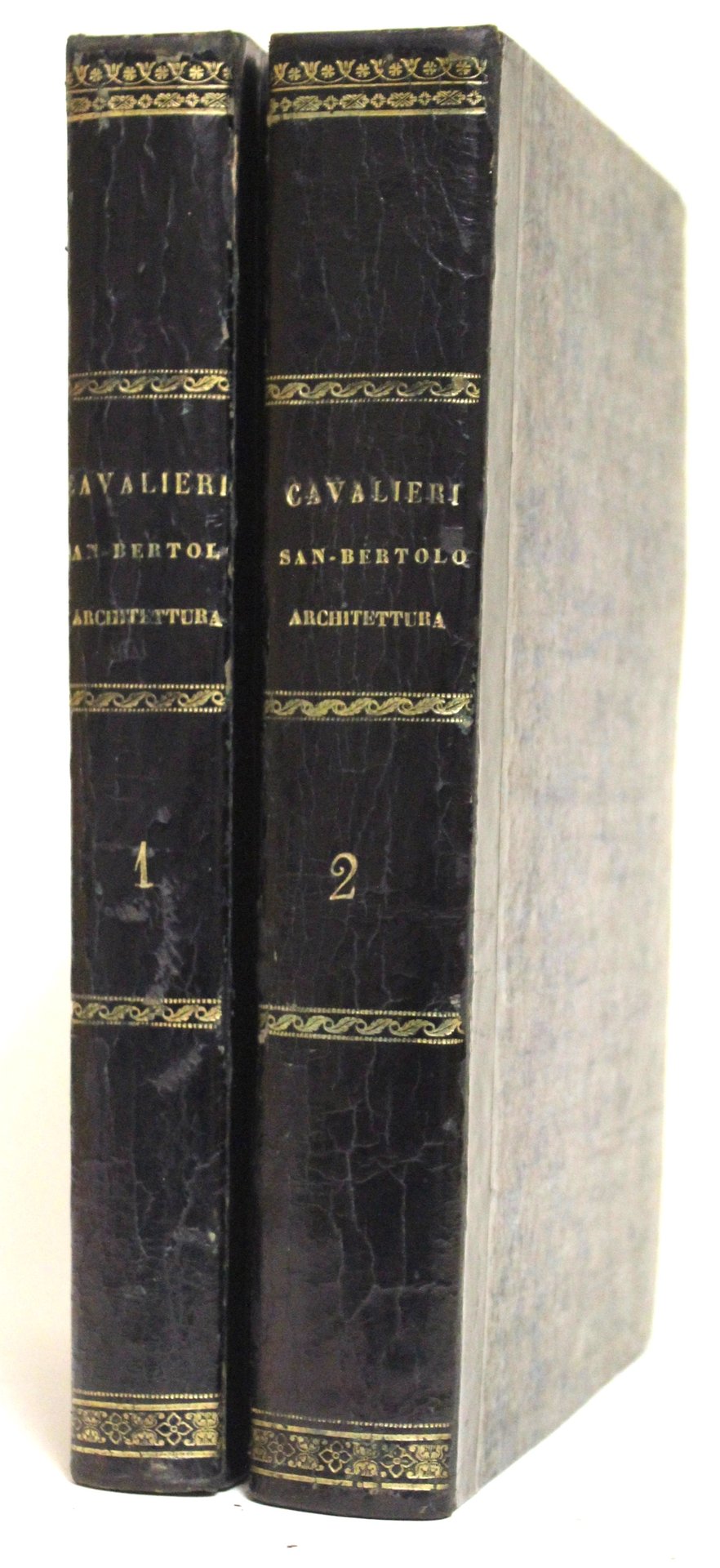 2 volumi in 4° (mm 300x220); pagg. (8), 255 con 36 tavole incise fuori testo (malnumerate 35 essendoci due tavole 26); pagg. 388, (12 di indice); con tavv. 32 f.t. per tavole 68 complessive (36, mal numerate 35, nel primo tomo e 32 nel secondo), tutte incise in rame fuori testo, spesso ripiegate, alcune firmate da Bassaglia. Elegante legatura coeva in mezza pelle blu scuro con titolo, fregi e filetti in oro al dorso.Buona edizione (la prima è del 1826-27) di questo celebre trattato di architettura, divisa in cinque libri.Il primo volume comprende i primi due libri e tratta dei lavori di terra: costruzione, difesa e riparazione degli argini; forma, struttura e pertinenze delle strade; dei lavori in legname e ferro, proprietà del legname: taglio, dimensioni, denominazioni, trasporto, conservazione, incurvamento artificiale, collocamento, congiunzioni, preservazione; ponti; dighe. Il secondo tomo comprende i libri 3-5 e si occupa di lavori murali; pietre naturali e artefatte; volte; intonachi e pavimenti; sostegni; costruzioni marittime; macchine e manovre architettoniche; stime; lavori di terra; occupazione di terreni campestri e fabbriche. Il matematico ed ingegnere idraulico Nicola Cavalieri (Civitavecchia, 1788-1867) insegnò nell'Archiginnasio romano, ove fu tra i fondatori della Scuola degli Ingegneri, e fu ingegnere nel dipartimento delle acque e strade. Graesse, II, 92; Brunet, I, 1695, cita quella 1827-1829.Ottimo esemplare, molto ben conservato con solo qualche lieve fioritura. Lieve traccia d'uso a cuffie e spigoli, leggere abrasioni ai piatti.