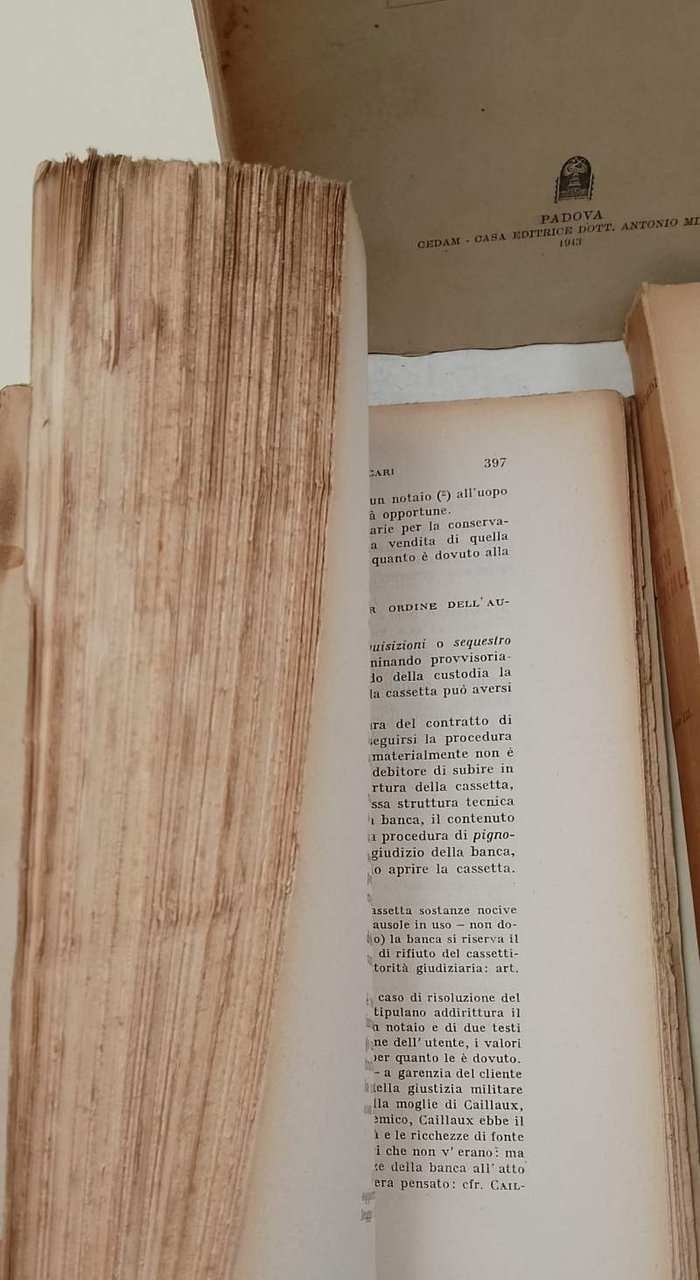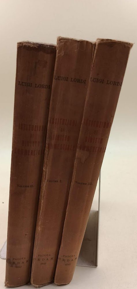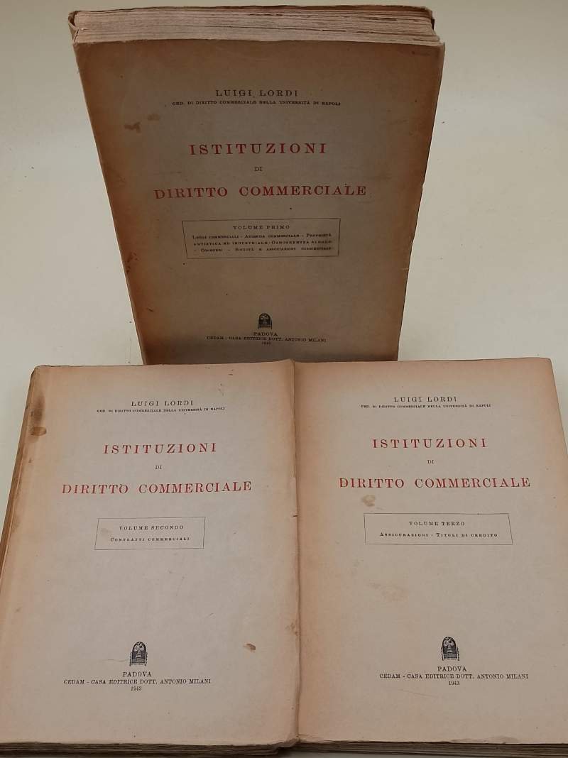 3 voll. in 8' gr., bruniture ai dorsi, pieghe e lievi segni d'uso alle cop., interni in buono stato, tibro d'appartenenza alle prime bianche, segni del tempo. vol. I Leggi commerciali-Azienda commerciale-Proprieta' artistica ed industriale-Concorrenza sleale-Consorzi-Societa' e Associazioni commerciali, pp. XV+482 vol. II- Contratti commerciali, pp. XI+476 vol. III- Assicurazioni-Titoli di Credito, pp. XI+390 ***Due to bureaucratic reasons, books dated over 70 years old cannot be immediately exported, please contact us before placing the order.***