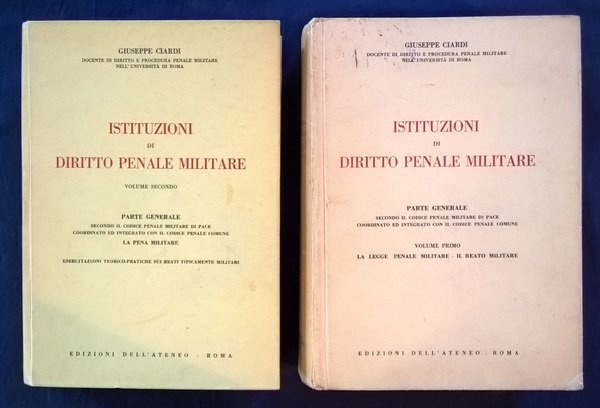 due volumi in-8°, 232x162 mm, leg. rigida in cartonato editoriale, con titoli in rosso e nero al paitto ant. ed al dorso; pp. 499, [1]; 544. L'opera comprende i seguenti due volumi: 1: La legge penale militare, il reato militare. 2: La pena militare : esercitazioni teorico-pratiche sui reati tipicamente militari. Rif.: IT\ICCU\UBO\0293604. Cond.: Leggeri segni d'uso alla legatura, brunitura al dorso. Presenza di alcune sottolineature ed annotazioni di studio a matita. Opera in condizioni generali molto buone.