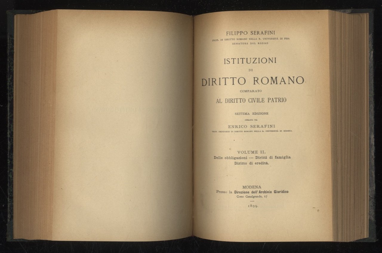 Modena, presso la direzione dell'Archivio Giuridico, 1899, volumi 2, legati in un tomo, in-8, legatura coeva in mezza tela, piatti in cartone marmorizzato, pp. XII, 458 - X, 418. Poche e leggerissime sottolineature a matita. Condizioni molto buone.