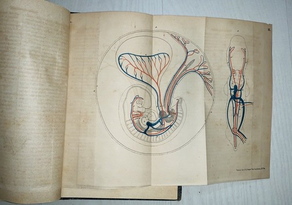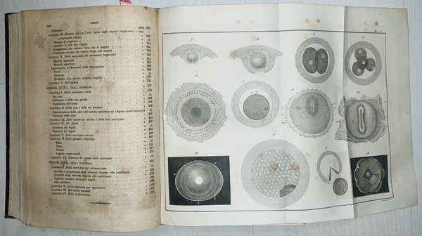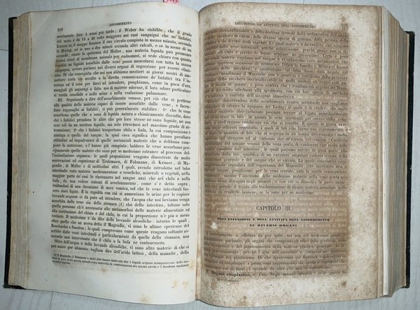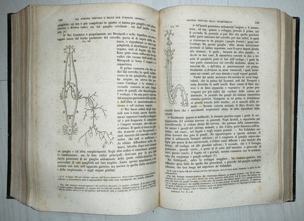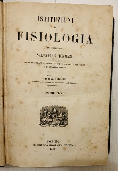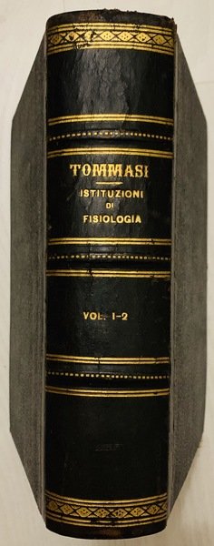 In 8° (23x15 cm); XIV, 508 pp. e 751, (1) pp. Legatura coeva in mezza pelle scura con titolo e fregi in oro al dorso. Piatti foderati con carta nera coeva, qualche strofinatura. Qualche pagina uniformemente brunita a causa della qualità della carta e comune a tutti gli esemplari e per il resto volume in buone-ottime condizioni di conservazione. Seconda edizione corretta e notevolmente aumenta rispetto alla prima del 1847-1848. Salvatore Tommasi (Roccaraso in provincia dell'Acquila, 26 luglio 1813 Napoli, 18 luglio 1888) è stato un patologo italiano, importante rappresentante della ricerca medica nella seconda metà dell'Ottocento in Italia e uno dei maggiori esponenti del Positivismo italiano. Nato in Abruzzo, da genitori originari di Accumoli, studiò prima nel seminario di Ascoli Piceno e proseguì la sua formazione all'Università di Napoli dove si laureò in Medicina nel 1845. Nel 1842 fondò una rivista di divulgazione e ricerca medica dal titolo Il Sarcone, in onore del celebre medico partenopeo Michele Sarcone (1731-1797). Nel 1846 ottenne la cattedra di Clinica Medica a Napoli che perse nel 1848 per le sue attività antiborboniche che lo costrinsero a lasciare il Regno delle Due Sicilie, dopo essere stato imprigionato ed esiliato per aver partecipato come deputato liberale per la provincia dell'Aquila nel Parlamento napoletano frutto delle concessioni date dal sovrano borbonico Ferdinando II. Trasferitosi esule dapprima in Francia e poi in Inghilterra, si stabilì definitivamente a Torino, dove versò in condizioni di estrema povertà che non gli impedirono di contribuire alla vita culturale e scientifica della città, diventando uno dei fondatori della Società delle scienze biologiche (1853-1857). Nel 1859, dopo l'annessione della Lombardia, venne ripagato del suo attivismo politico e scientifico con l'assegnazione alla cattedra di Clinica Medica all'Università di Pavia; tra i suoi allievi vi fu Camillo Bozzolo. Nel 1860 il suo impegno politico a favore dell'unificazione d'Italia si espresse nella missione di mediazione per conto del governo Cavour tra Giuseppe Garibaldi e Vittorio Emanuele II e nella promozione dell'annessione degli Abruzzi nel Regno d'Italia. Il 13 marzo 1864, per i suoi alti meriti patriottici e scientifici venne nominato senatore nel Parlamento italiano. Nel 1865 poté fare ritorno all'Università di Napoli dove ottenne la cattedra di Patologia Speciale Medica che mantenne fino alla sua morte nel 1888. La sua attività è testimoniata in gran parte dalla sua opera principale, le Istituzioni di Fisiologia che vide ben due revisioni, nel 1852 e nel 1860. L'opera è un vero e proprio manuale di fisiologia nel quale Tommasi invitava i suoi lettori medici a non praticare la medicina come un'arte ma come una disciplina scientifica che doveva avvalersi di tutte le scoperte in ambito empirico e tecnico dell'epoca e soprattutto di una valida e severa sperimentazione. Dopo il suo ritorno a Napoli, divenne uno dei maggiori esponenti e promotori della teoria evoluzionistica di Charles Darwin e nel 1866 pronunciò una prolusione accademica dal titolo Il naturalismo moderno che viene considerata uno dei manifesti programmatici del positivismo italiano.Fu anche promotore e curatore di una rivista di Patologia dal titolo Il Morgagni. Giornale indirizzato al progresso della medicina che ospitava discussioni e ricerche nell'ambito della patologia. Proprietario di una cospicua biblioteca, la donò per testamento alla Provincia dell'Aquila, che ne fece il nucleo centrale della Biblioteca Provinciale a lui intitolata. Indice: Primo volume: Proemio; Prolegomeni; Sezione prima. Capitolo I. Della composizione della sostanza organica; Capitolo II. Dei principi immediati; Capitolo III. Maniera con cui le sostanze organiche si trovano con le inorganiche congiunte; Capitolo IV. Metamorfosi della materia organica. Forme della materia organica. Capitolo I. Origine della forma primitiva. Sezione terza. Delle funzioni in generale. Capitolo I. Divisione generica delle funzioni; Capitolo II. Della vita ed organismo in generale; Capitolo III. Caratteri di differenza fra gli animali ed i vegetali. Sezione quarta. Rapporto dell'organismo col mondo esteriore. Libro primo. Della vita organica. Sezione prima. Della digestione. Capitolo I. Del tubo alimentare; Capitolo II. Degli alimenti; Capitolo III. Prendimento delle materie alimentari; Capitolo IV. Dell'insalivazione; Capitolo V. Dell'inghiottimento; Capitolo VI. Della digestione stomachca; Capitolo VII. Digestione intestinale. Sezione seconda. Dell'Assorbimento. Capitolo I. Condizioni anatomiche de' vasi linfatici; Capitolo II. Assorbimento venoso; Capitolo III. Estensione ed attività dell'assorbimento ne' diversi organi; Capitolo IV. Circostanze che prendon parte al grado dell'assorbimento. Sezione terza. Centro della vita vegetativa. Capitolo I. Condizioni anatomiche de' vasi; Capitolo II. Del sangue; Capitolo III. Della circolazione. Sezione quarta. Della Respirazione. Capitolo I. Forme degli organi della respirazione; Capitolo II. Condizioni de' mezzi esterni; Capitolo III. Maniera con cui l'aria opera sugli organi respiratori e suoi cangiamenti chimici; Capitolo IV. Della meccanica dei movimenti respiratori; Capitolo V. Dell'ematosi. Sezione quinta. Delle secrezioni. Capitolo I. Della secrezione renale; Capitolo II. Della cute e delle sue funzioni; Capitolo III. Delle membrane sierose e della loro secrezione; Capitolo IV. Del fegato; Capitolo V. Delle secrezioni mucose; Capitolo VI. Delle glandule sanguigne; Capitolo VII. Influenza del sangue sulle secrezioni. Sezione sesta. Della nutrizione. Capitolo I. Della nutrizione per intosuscezione; Capitolo II. Della nutrizione per apposizione; Capitolo III. Del calore animale; Capitolo IV. Della fosforescenza. Secondo volume. Libro secondo. Della vita riproduttiva. Idee generali. Capitolo I. Dell'eterogenia; Capitolo II. Dell'omogenia; Capitolo III. Dell'omogenia sessuale; Capitolo IV. Del