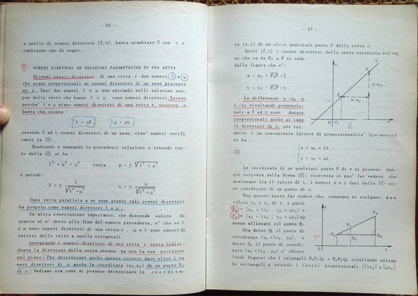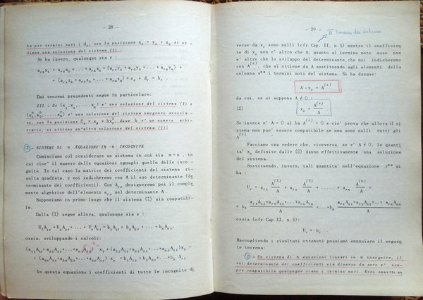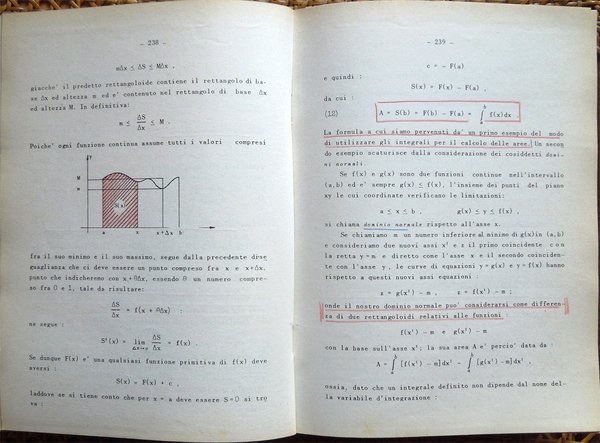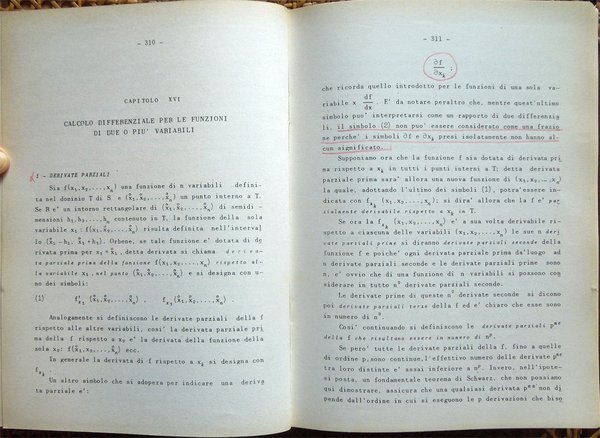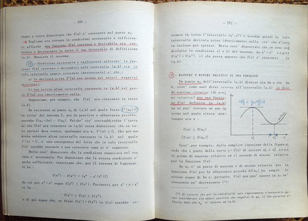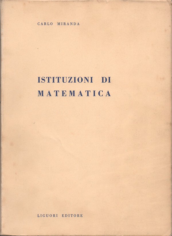 In-8° (23,6 x 17 cm), pp. 496, copertina editoriale con qualche normale segno d'uso. Alcune sottolineature e segni a matita rossa e blu a circa 130 pagine delle prime 331. Indice: I. Calcolo combinatorio; II. I determinanti; III. Sistemi di equazioni lineari; IV. Numeri reali - Teoria della misura; V. Geometria analitica della retta e del piano; VI. I numeri complessi; VII. Polinomi ed equazioni algebriche; VIII. Funzioni di una variabile; XI. Derivate e differenziali delle funzioni di una variabile; X. Teoremi fondamentali e applicazioni del calcolo differenziale; XI. Integrali indefiniti; XII. Prime formule di quadratura. Cubatura e rettificazione; XIII. Successioni e serie; XIV. Geometria analitica dello spazio; XV. Funzioni di più variabili; XVI. Calcolo differenziale per le funzioni di due o più variabili; XVII. Calcolo integrale per le funzioni di due o più variabili; XVIII. Equazioni differenziali; XIX. Elementi di calcolo numerico; XX. Nozioni di calcolo delle probabilità. Appendice. 1. Nozioni generali di teoria degli insiemi; 2. Simboli convenzionali; 3. Applicazioni fra insiemi; 4. Relazioni di equivalenza. Insieme quoziente; 5. Vettori; 6. Campi vettoriali.