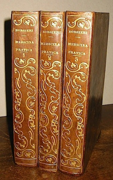 8vo (cm. 19,5), 12 parti in 3 Voll. Opera completa di oltre 1000 pp. Belle legarure coeve napoletane in vitello maculato con dorso interamente decorato con fregi oro. Titoli oro. Tagli colorati a spruzzo. Tutti e tre i volumi in eccellente stato di conservazione. Giambattista Borsieri (1725-1785) medico trentino, fu professore di anatomia all’Università di Pavia.