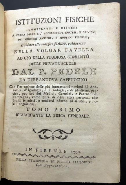 Istituzioni fisiche compilate, e distese a norma delle più accreditate ipotesi, e opinioni dei migliori antichi, e moderni filosofi. E ridotte alla maggiore facilità, e chiarezza nella volgar favella ad uso della Studiosa Gioventù delle Private Scuole. dal P. Fedele da Terranuova Cappuccino. Con l’estensione delle più interessanti nozioni di Anatomia, d’Igrologia, di Fisiologia, e di Medicina pratica, per uso dei Medici, Cerusici, e Parrochi di Campagna, come pure di ogni altra persona, che brami istruirsi, e rendersi adorno di sì utili, e nobili cognizioni.