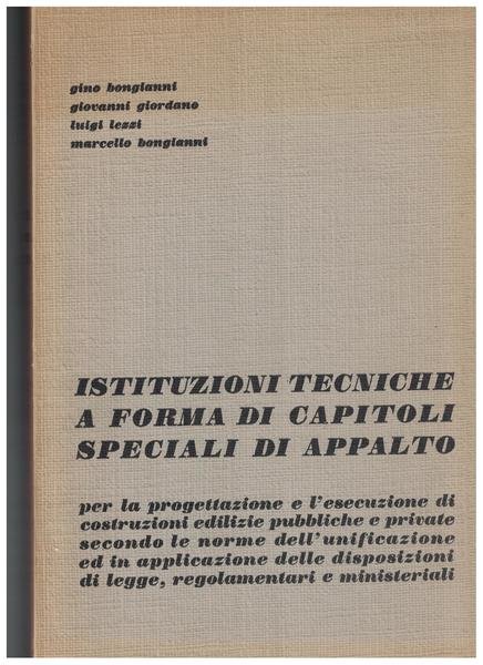 G. Bongianni, G. Giordano, L. Lezzi, M. Bongianni, Istituzioni tecniche a forma di capitoli speciali di appalto. Per la progettazione di costruzioni edilizie pubbliche e private secondo le norme dell'unificazione ed in applicazione delle disposizioni di legge, regolamentari e ministeriali.