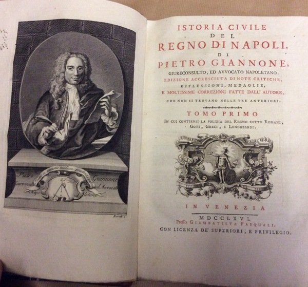 In-8 gr. (mm. 273x185), 4 volumi, mz. pelle fine Ottocento, titolo oro su tassello al dorso, conserv. le legature orig. in cartoncino rustico, pp. (20),411; (4),452; (4),439; VII,511; con un ritratto dell'A. all'antiporta, inc. in rame da Baratti e 1 tavola di medaglie, pure inc. in rame fuori testo Il frontespizio del primo volume porta i titoli in rosso e nero e, su tutti i frontesp., grande marca tipografica inc. in rame; testo su due colonne, ornato da graziose testate, grandi capilettera e finali xilografati. Nell'opera, dedicata a Carlo VI il Grande, "contiensi la Politica del Regno sotto Romani, Goti, Greci, Longobardi - Normanni e Svevi - Angioini ed Aragonesi - Austriaci". Completano l'opera i due volumi delle Opere Postume, in difesa della sua Storia Civile.. Con la sua professione di fede. Si aggiungono in questa edizione le annotazioni critiche del Padre Paoli, sopra il IX. Libro del Tomo Secondo della Storia Civile, e la risposta di Pietro Giannone alle suddette annotazioni - Alcune sue opere finora inedite, precedute dalla vita del medesimo Autore. Edizione prima veneta, pp. VII,360; VII,296.Cfr. Graesse,III,79 - Gamba,2254 (in Nota): Di Venezia havvi una nuova e accreditata edizione del 1766, con aggiunta delle "Opere postume", ivi pure impresse.Leggerm. corto del margine super., altrimenti fresco esemplare con barbe, ben conservato.